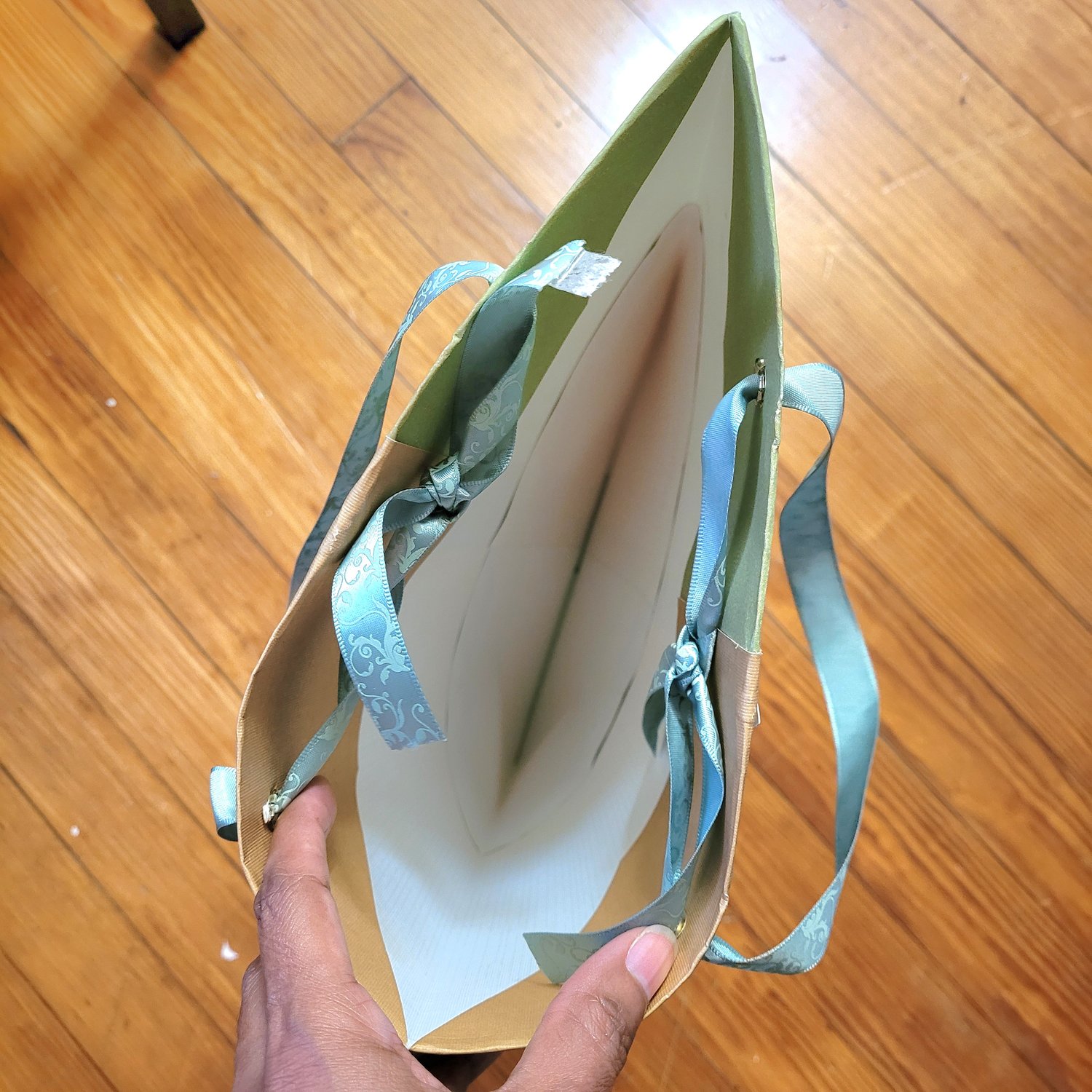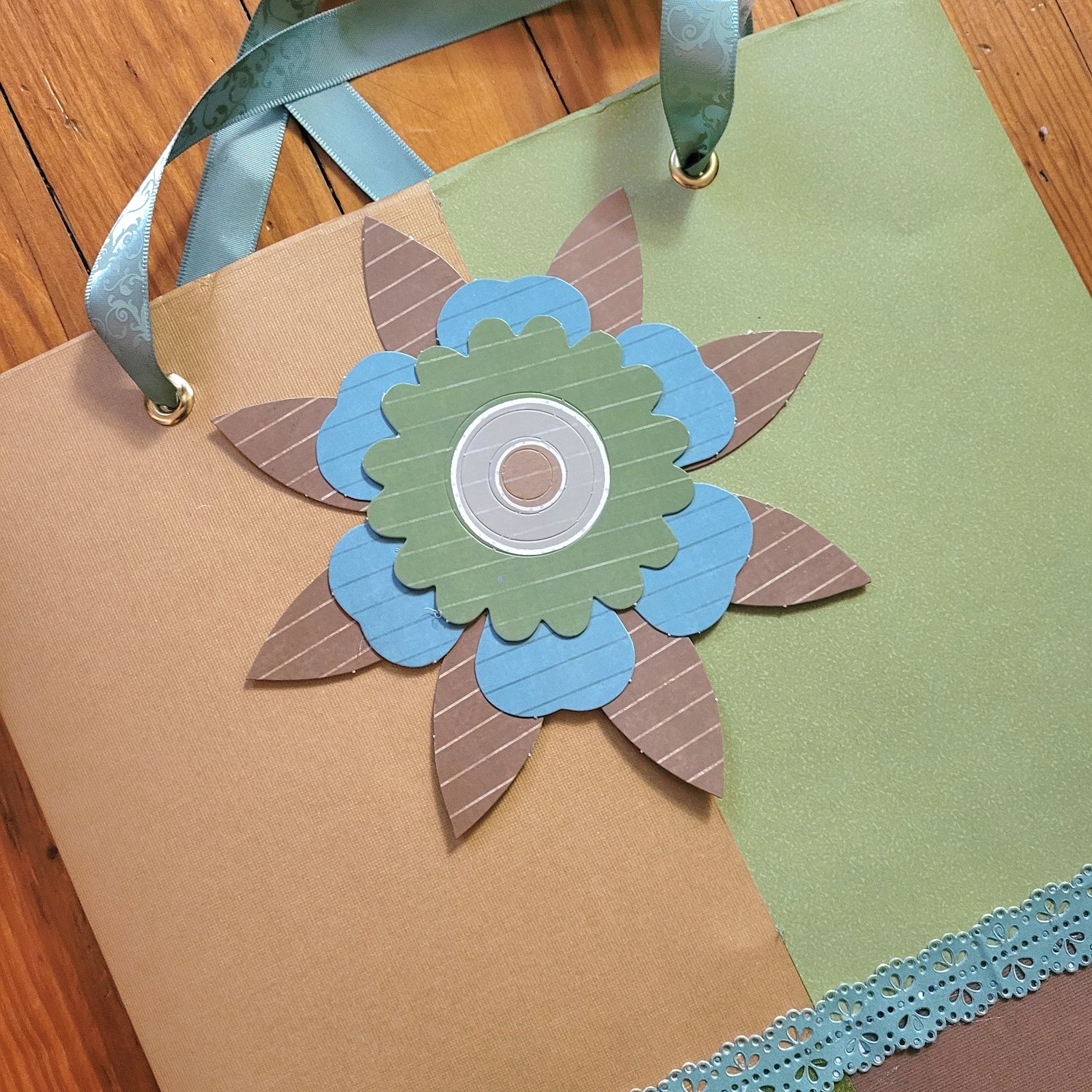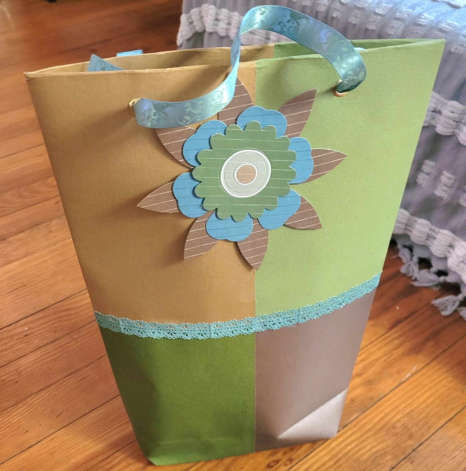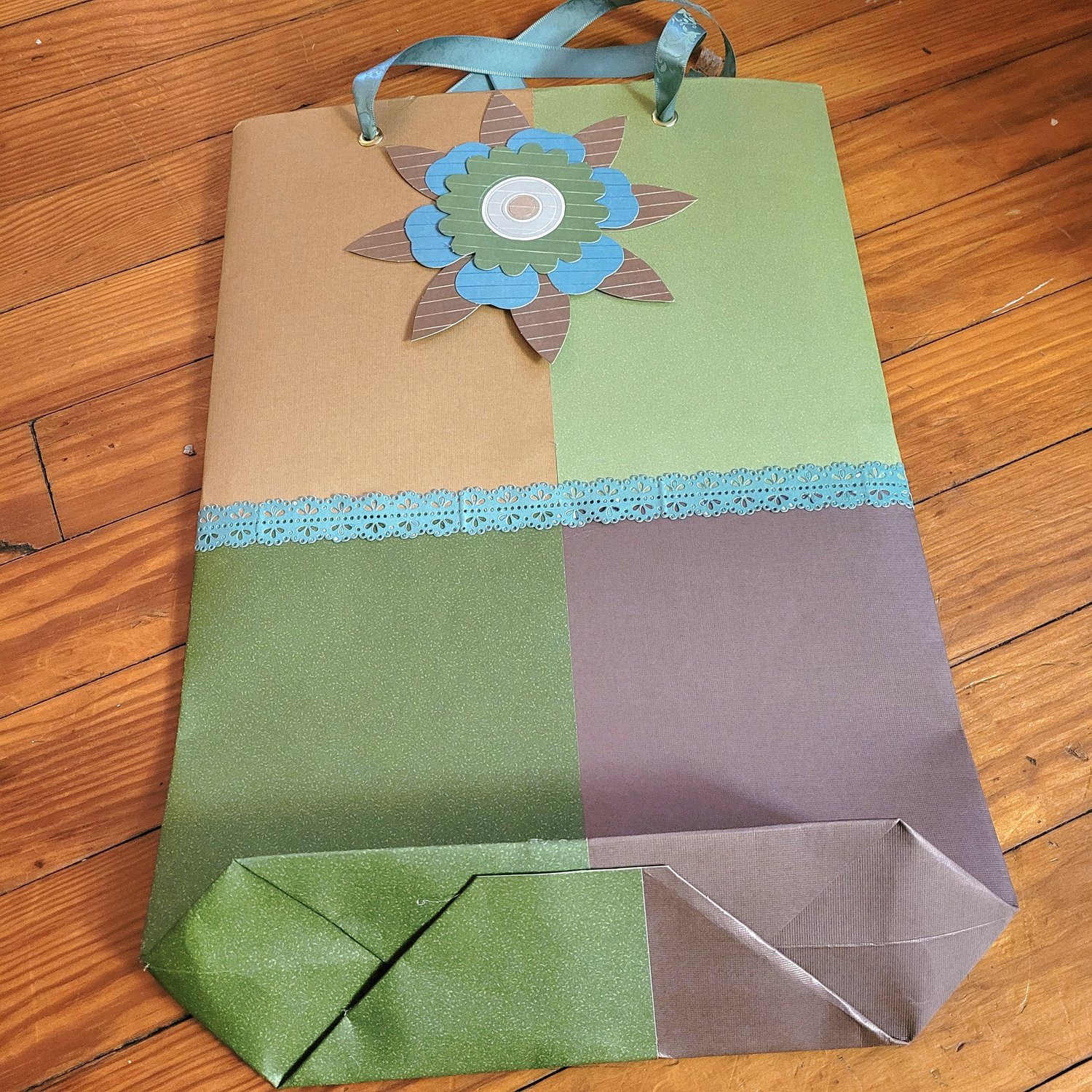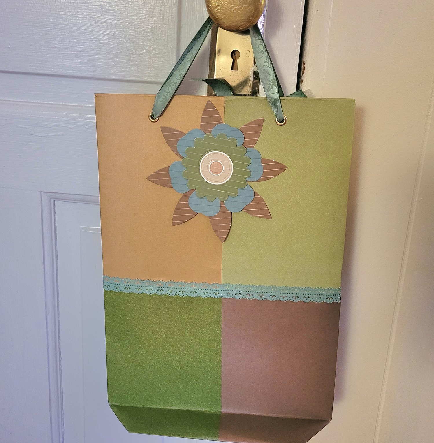 Keep your books, supplies, or gifts organized in style with this handmade large envelope-style tote. Crafted from four coordinated quadrants of high-quality scrapbooking cardstock, each tote features a harmonious palette of coffee brown, forest green, dark tan, and sage green, accented with a matching ribbon seam and floral decorative elements. The sturdy ribbon handles are adjustable and reinforced with metal eyelets for added durability and secure handling.