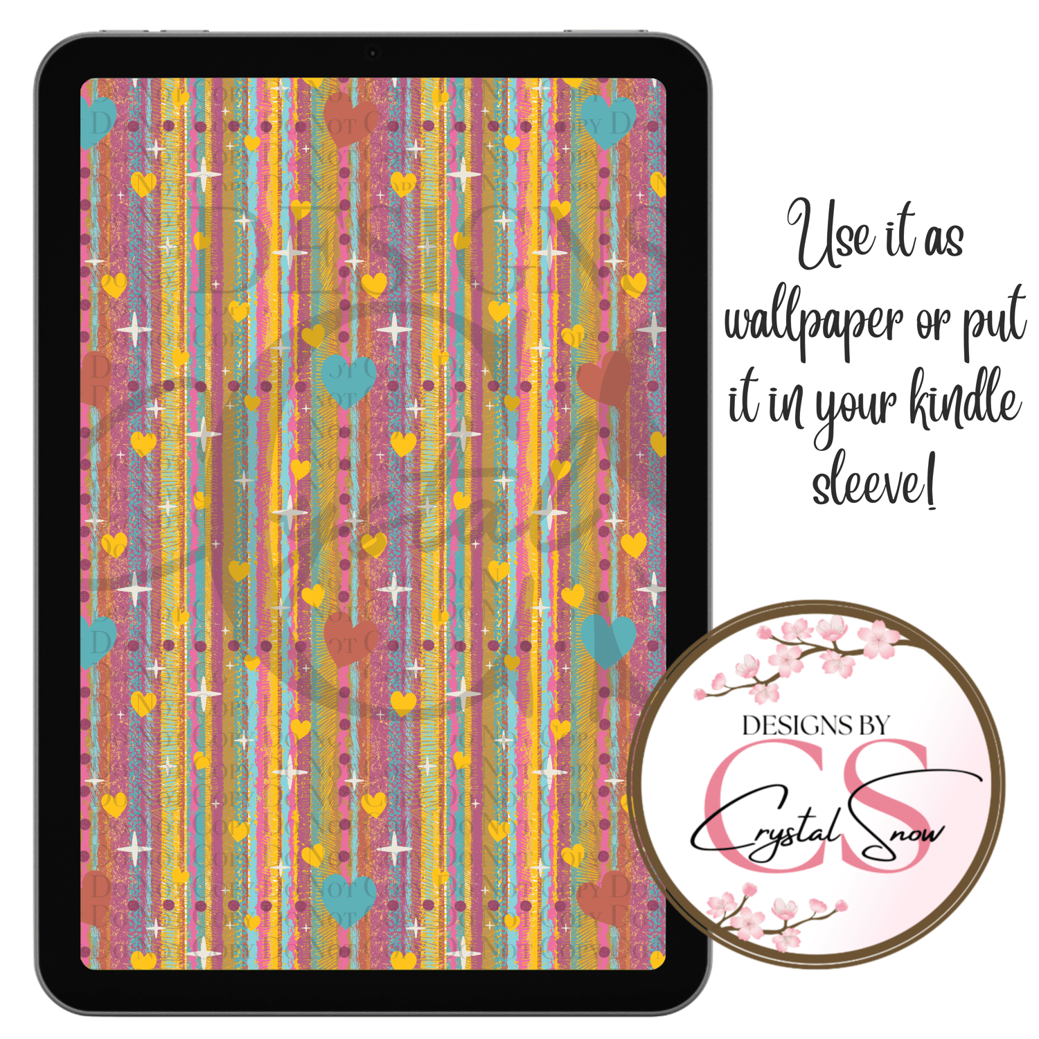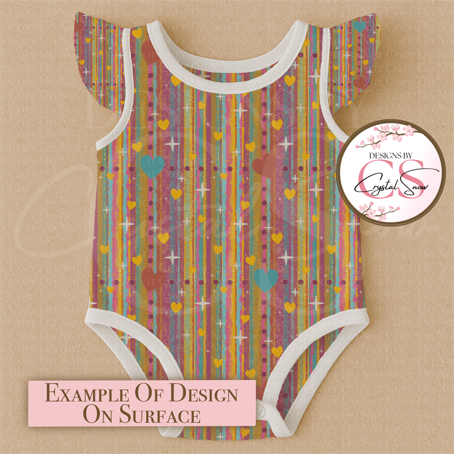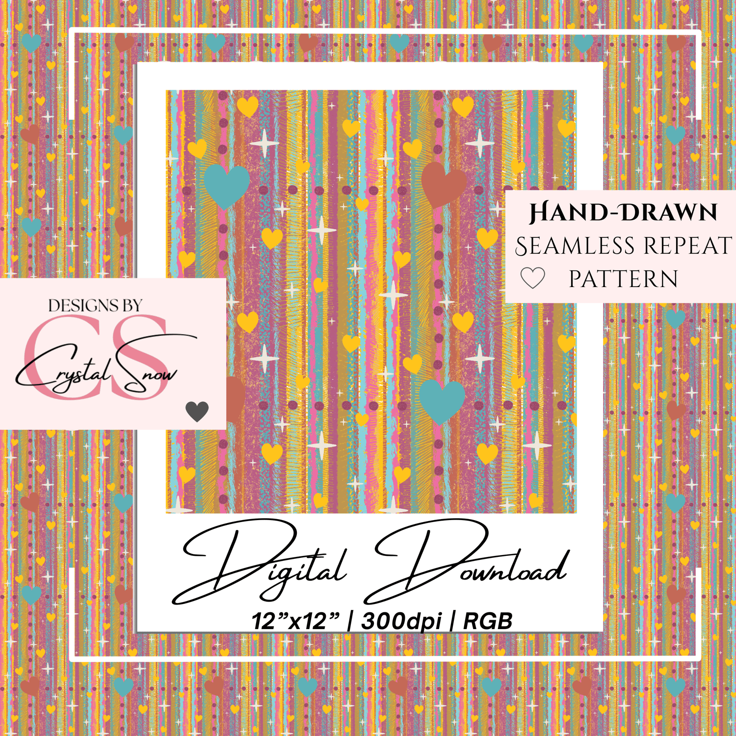 This Boho Brushstroke Love seamless pattern features hand-drawn abstract stripes, layered textures, sparkles, and colorful heart accents in a modern boho color palette. Designed as a true seamless repeat, this pattern is perfect for Valentine-themed projects that need a fun, artsy, and non-traditional look.