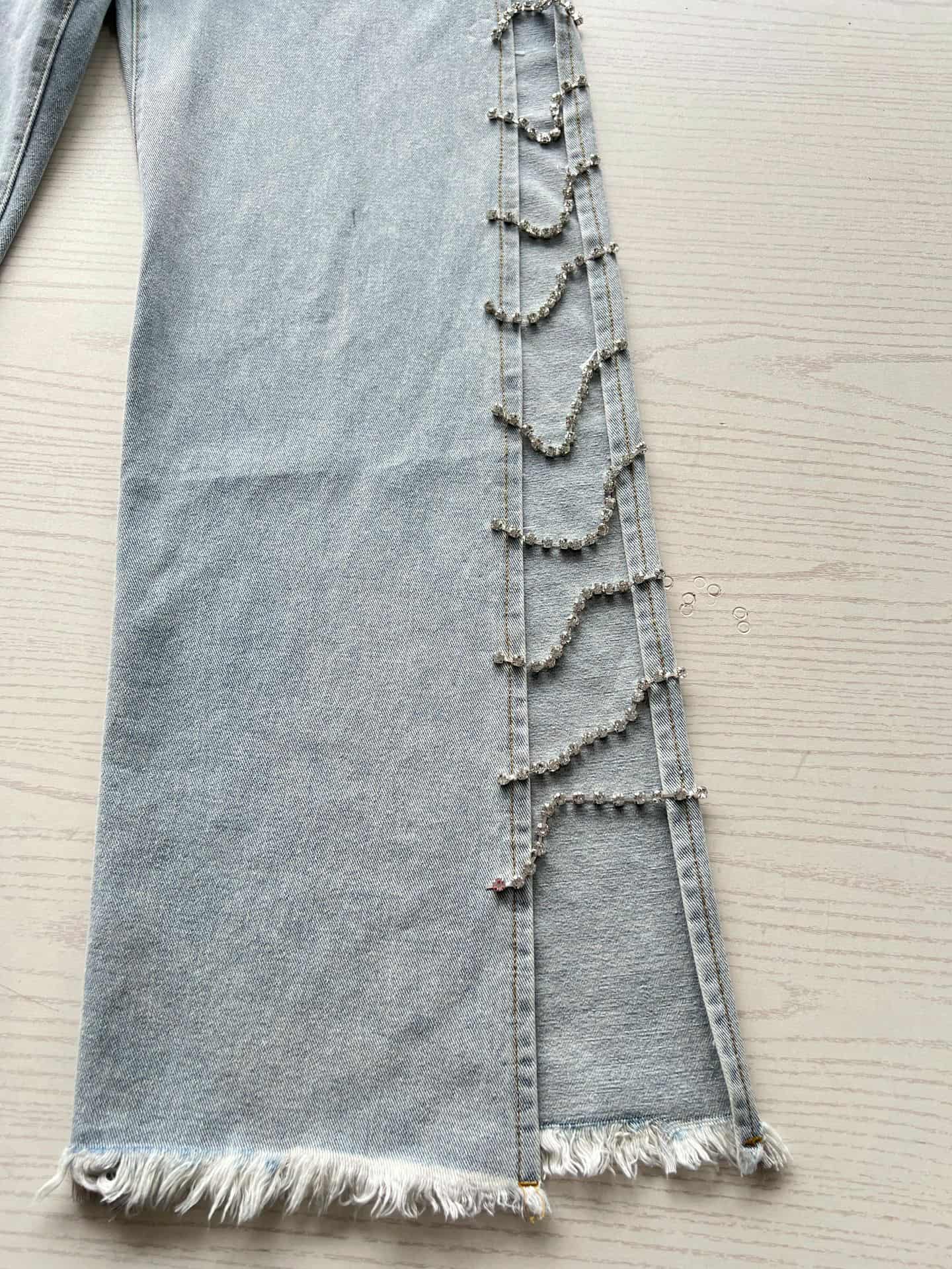 1.Lay the jeans flat in front of you, letting the fabric fall naturally.