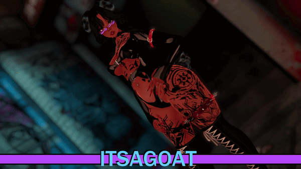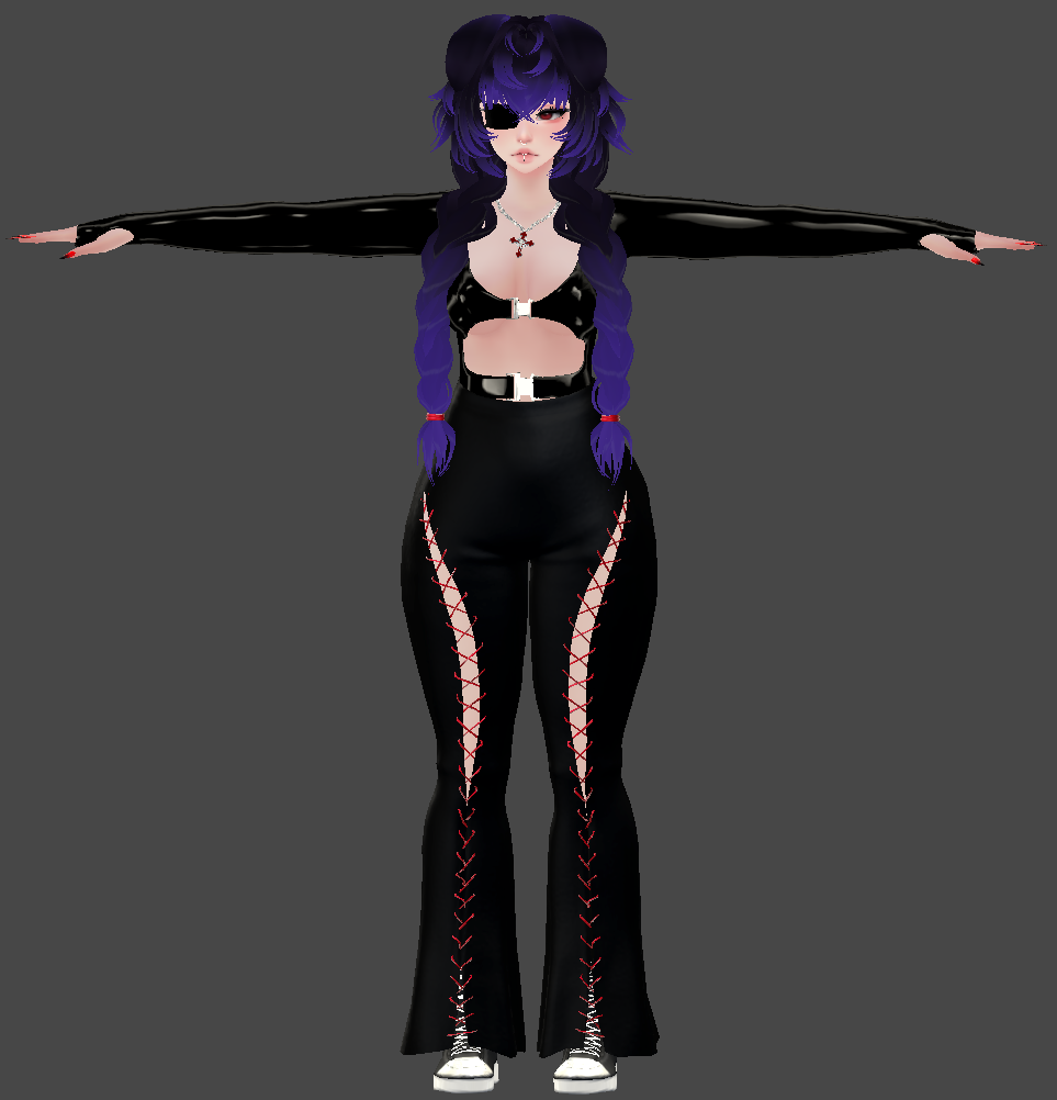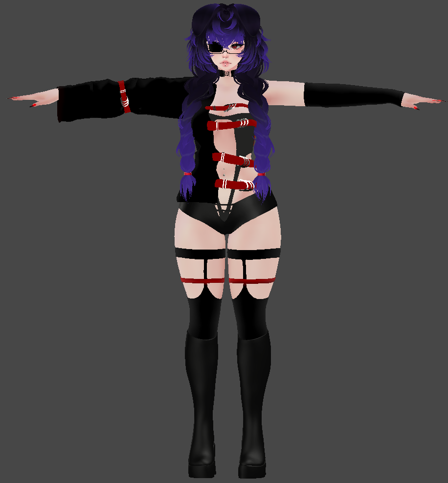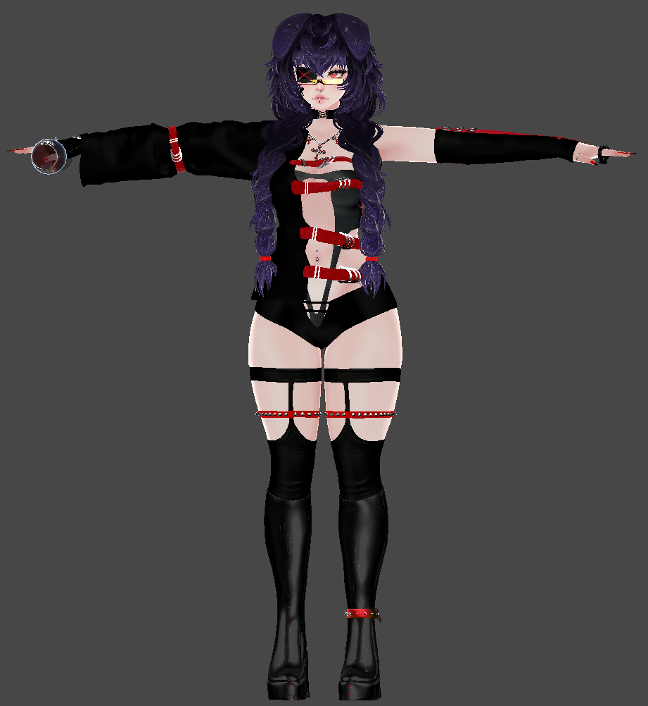 Head, Body, Tattoos, Hair 1, Hair 2, Hair 3, Glasses, Earrings, Necklace, Eye Patch, Mask, Band aids, Leather Glove, Sleeve, Buckle Bodysuit, Cross Top, Underwear Set, strap Jacket, Coat & wine Glass, Shorts, Laced Pants, Backless Dress, Boots, Convers Heeled, Convers, Knuckle dusters, Socks, Spikey Straps, Dog Ears & Tail, Cat Ears, Cat Tail, Rings,