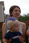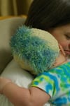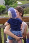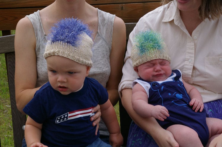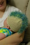 The inspiration for this hat came on a bus trip across campus. A young man in front of me had the most amazingly colored, fuzzy Mohawk. I was not the only one staring, though I may have been the only one trying to derive a hat from his head. Then I looked down at my newborn, and it hit me – while I could never in a million years get my attorney husband to wear a hat like that, my child wouldn’t have a choice!
