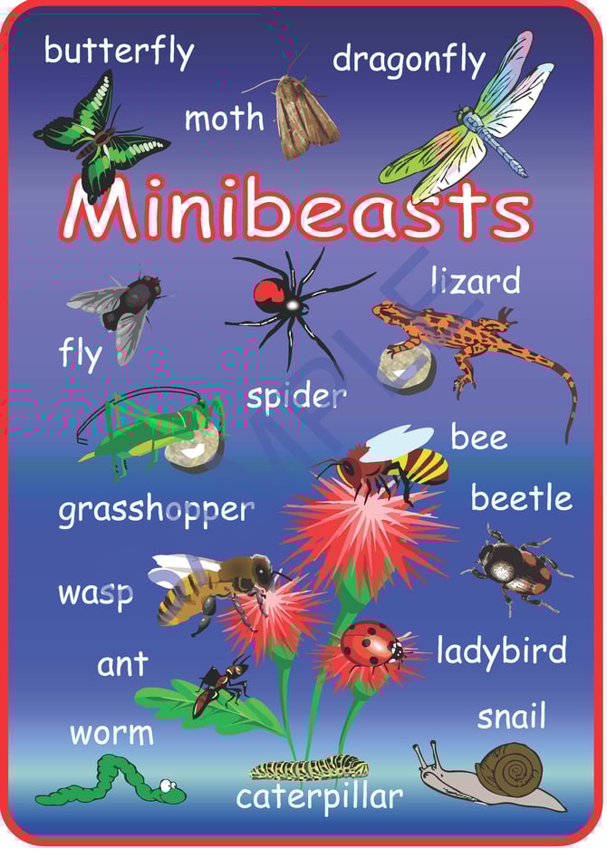 A Mini beasts Poster . A3 size . English version .For ESL, EFL ,Early years and SEN .