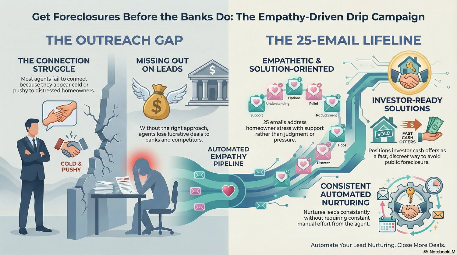 You know the potential of working with homeowners facing foreclosure, but reaching them effectively, with empathy and a real solution, is incredibly tough. Most agents struggle to connect, often coming across as cold or pushy.