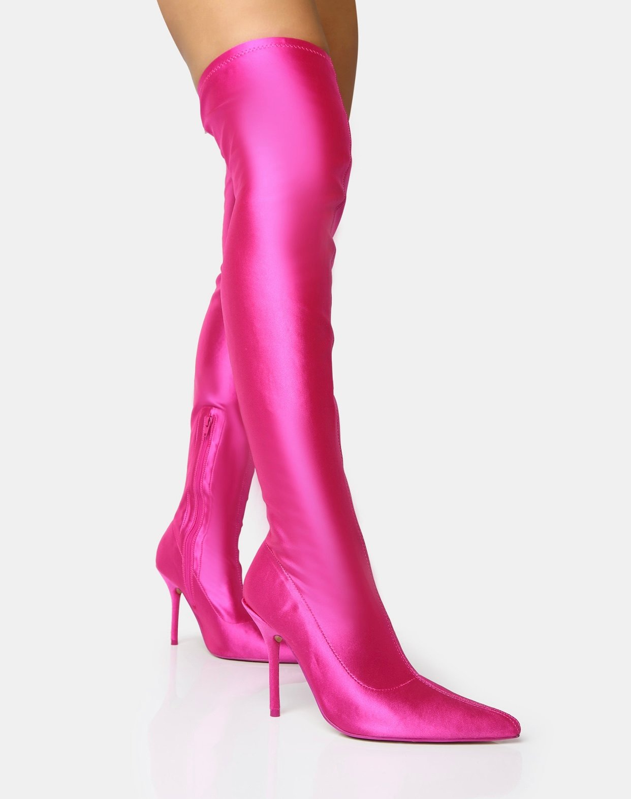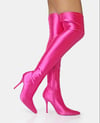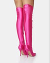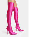 INSTINCT PINK LYCRA POINTED TOE STILETTO THIGH HIGH BOOTS