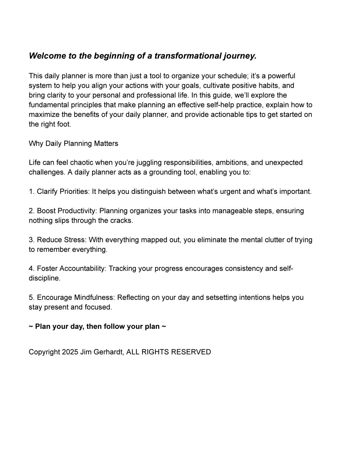 Discover the ultimate self-help planner designed to help you reclaim your time, align your actions with your goals, and foster a balanced and productive life. This comprehensive guide introduces the core principles of effective planning, including goal-setting, prioritization, mindfulness, and self-reflection. Learn how to use your daily planner to reduce stress, boost productivity, and create meaningful routines that support your personal growth. Packed with actionable tips and practical advice, this introduction sets the foundation for a transformative journey of intentional living—one day at a time.