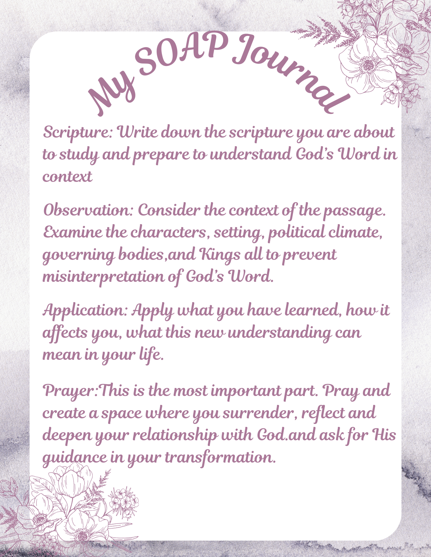 Free printable SOAP Journal study method. S scripture O observation A apply P prayer.