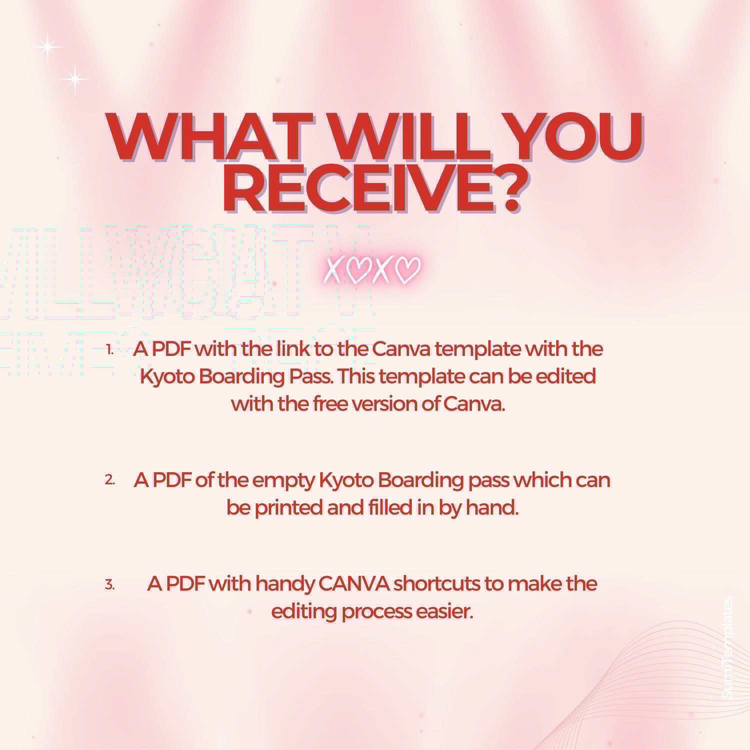 Craft your unique journey to Kyoto with our Editable Boarding Pass Template on Canva, perfect for adding to your collection or gifting to an Kyoto (or manga, anime, J-Pop, J-beauty) enthusiast. This template allows you to effortlessly create authentic-looking boarding passes, offering you the freedom to customize details such as flight dates, destination, and passenger names. Imagine presenting a customized boarding pass to Kyoto as a surprise dream trip surprise – the ultimate unforgettable gift for anyone who loves Japanese Culture, food, and shopping!