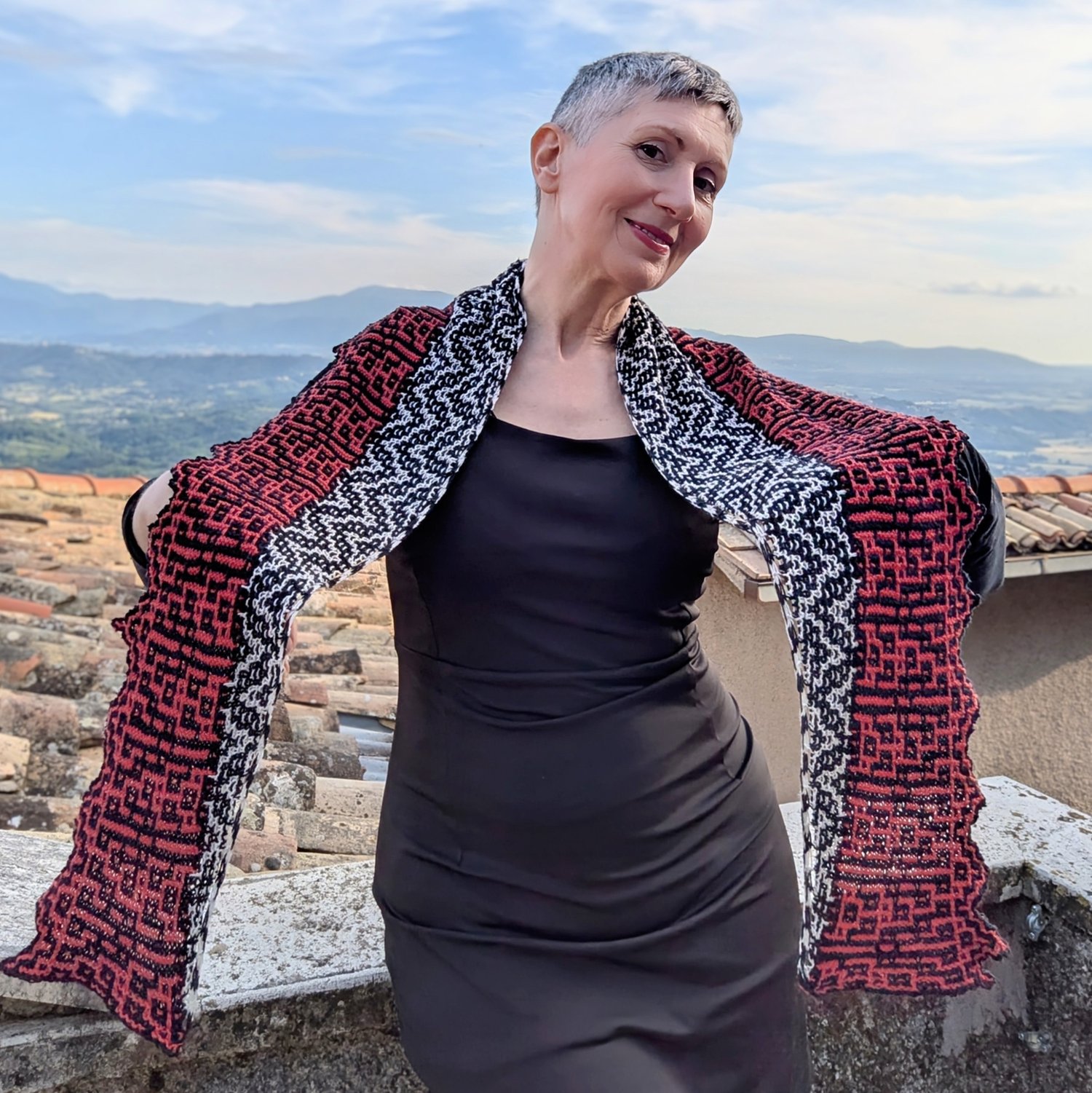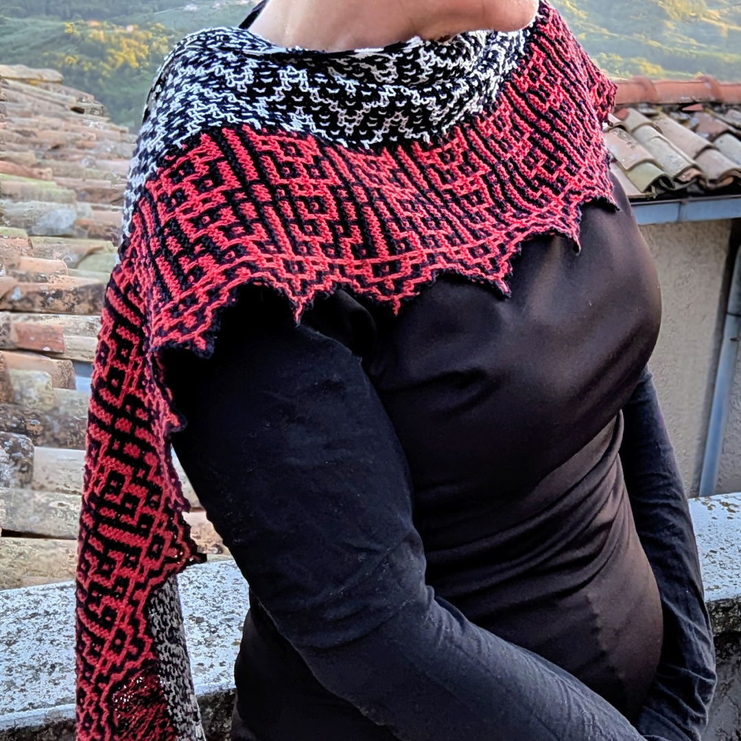 The construction is simple and elegant: a body shaped with regular increases, a garter-based mosaic fabric that plays with light and contrast echoing the traditional keffiyeh motifs, and a bold final border that changes the pace.