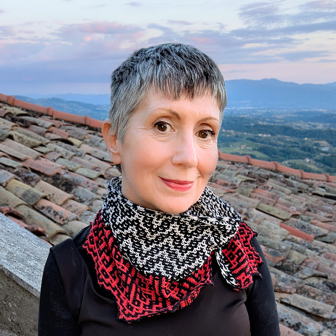 The pattern begins with an improved garter tab CO and continues with easy mosaic colorwork: just slipped stitches and garter ridges creating bold black-and-white motifs.