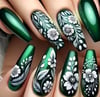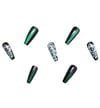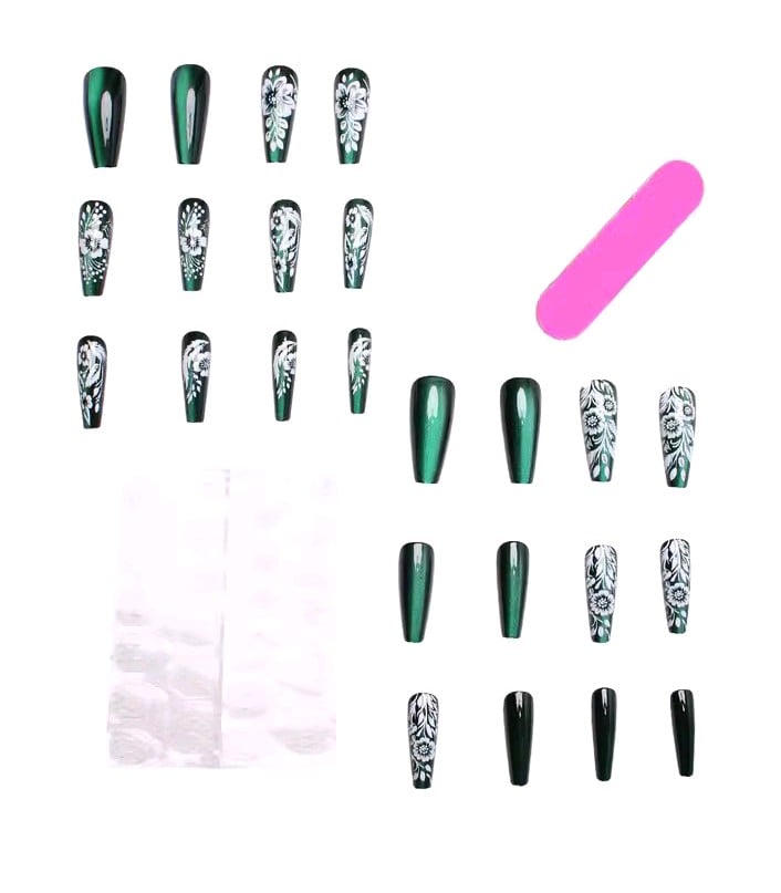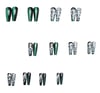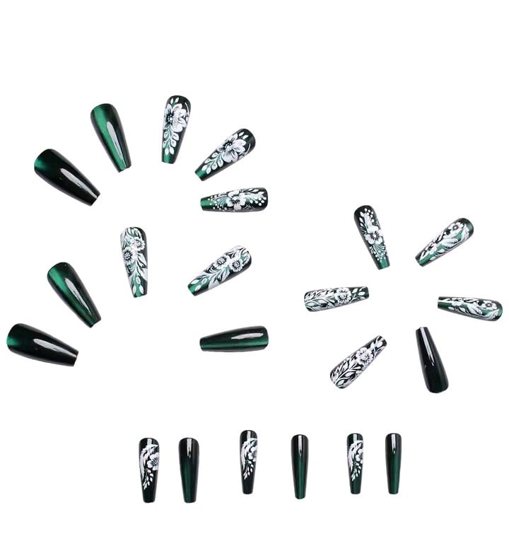 24 pieces of medium long fake nails, glossy green cat eye with white flowers