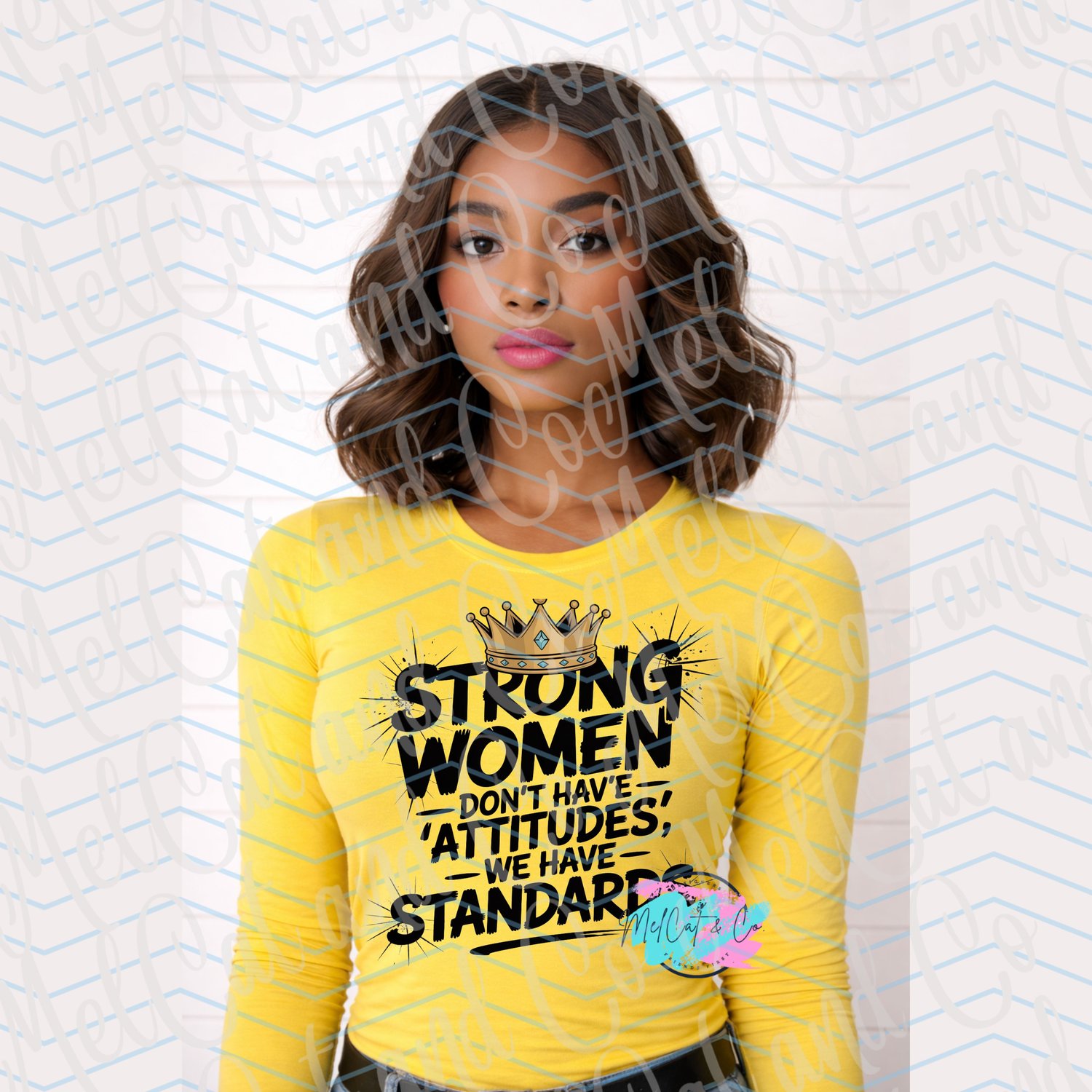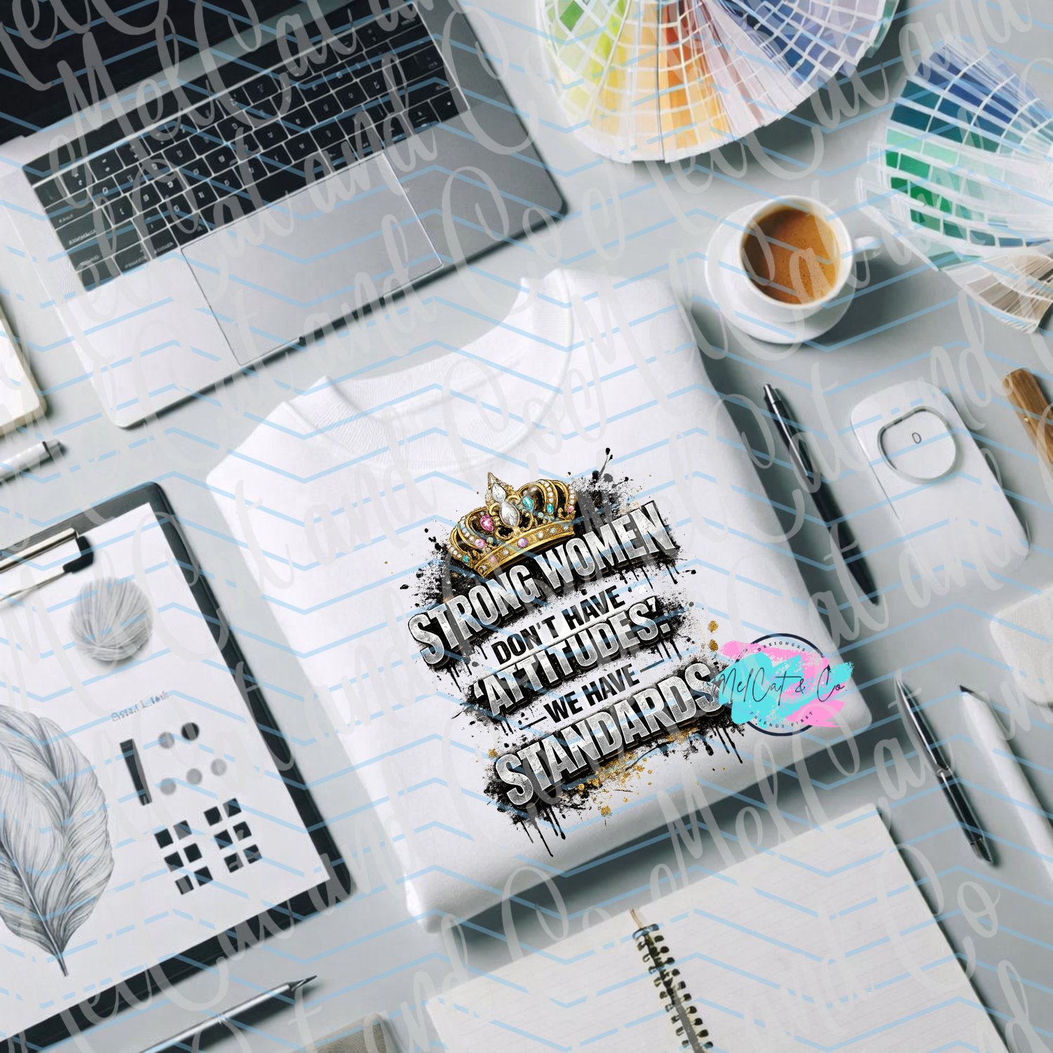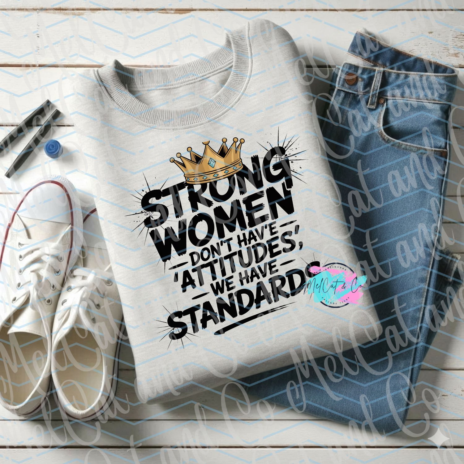 Make a bold statement with this powerful “Strong Women Don’t Have Attitudes, We Have Standards” digital design. Featuring distressed, high-impact typography topped with a regal jeweled crown, this design is made for women who know their worth and refuse to lower their standards.