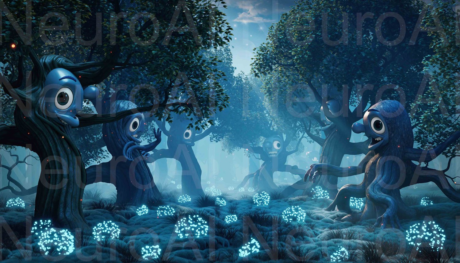 Enchanted forest with whimsical tree characters