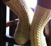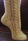 These feminine socks feature a simple 6-stitch cable interacting with a basic lace pattern to create a pretty and stretchy fabric. The socks are worked from the top down. The pattern includes written instructions and charted stitch patterns. The pattern is provided in woman's small .medium and large sizes with options for varying leg and foot lengths.
