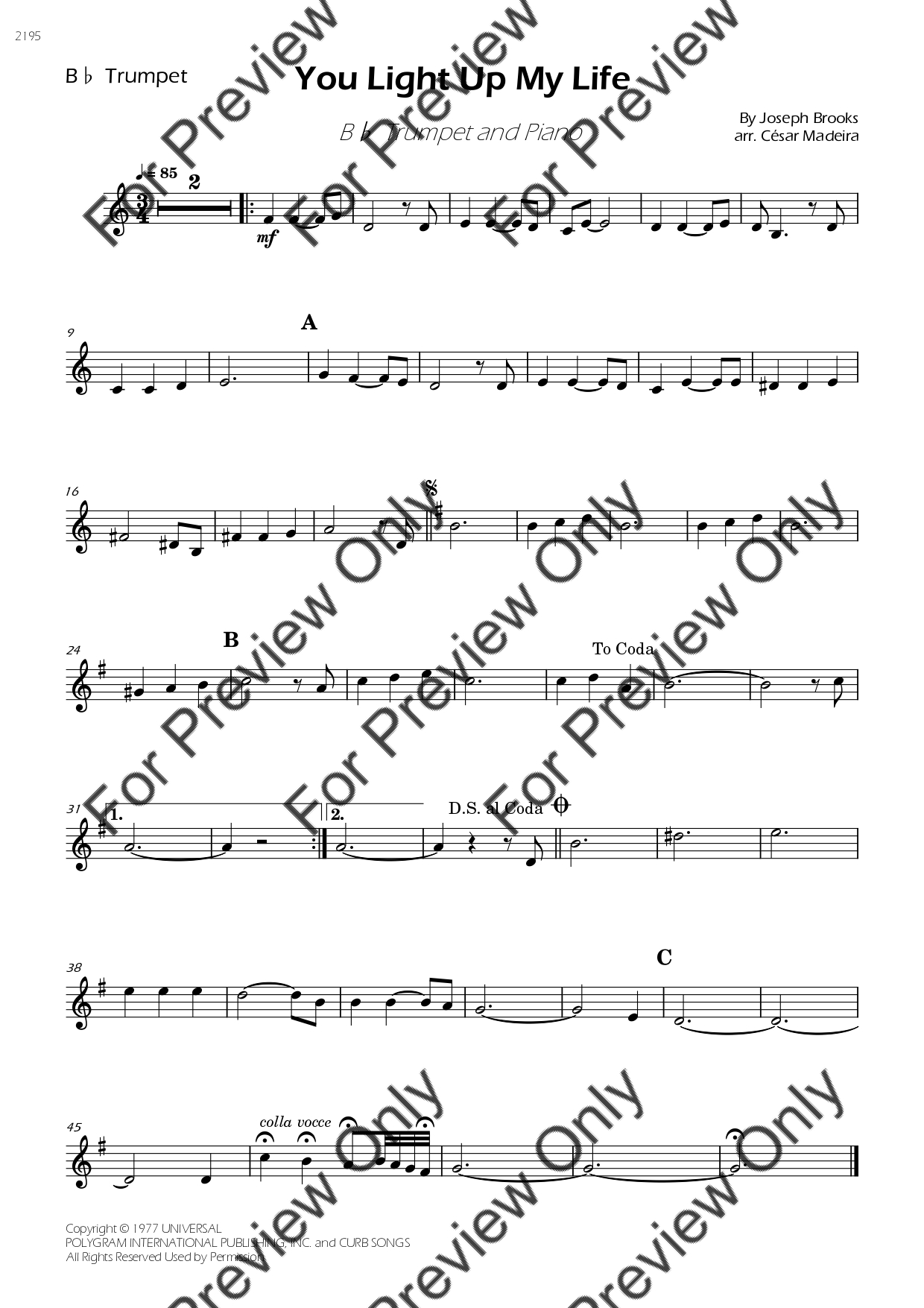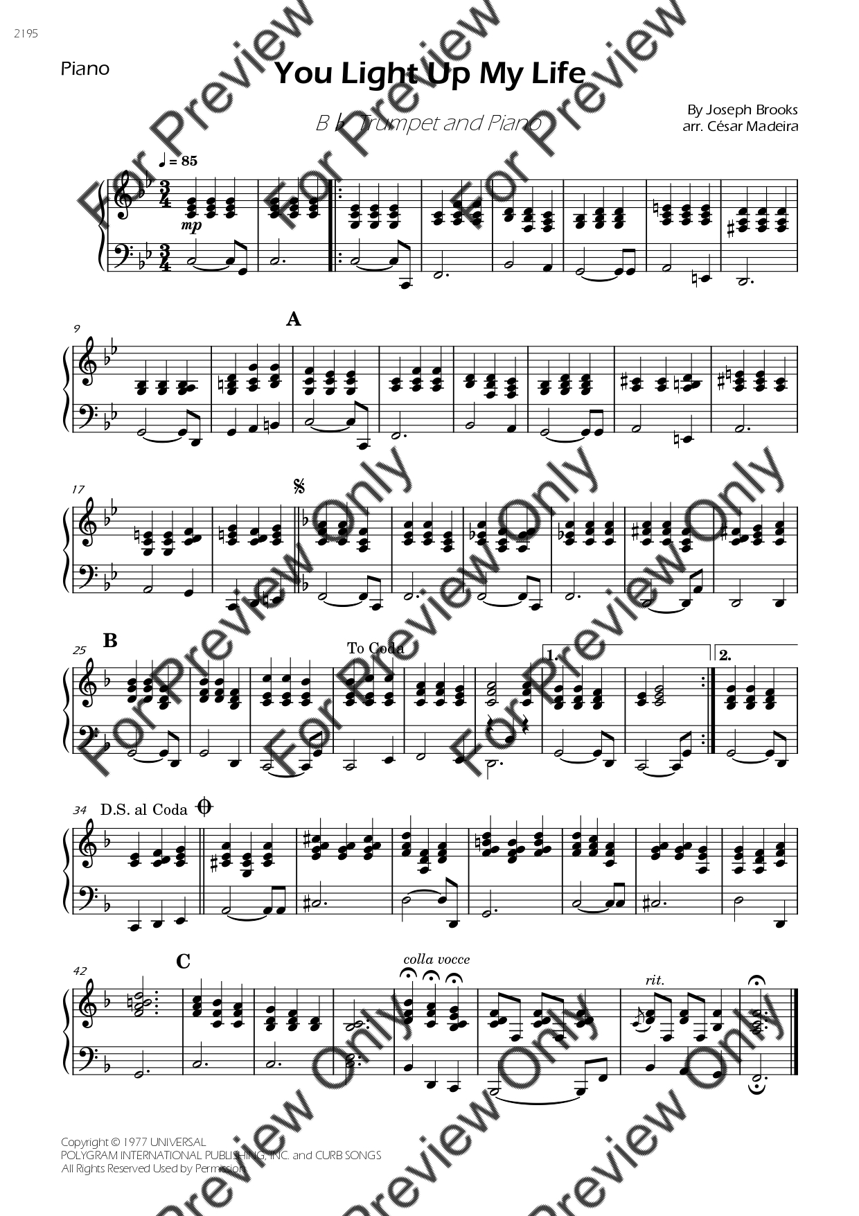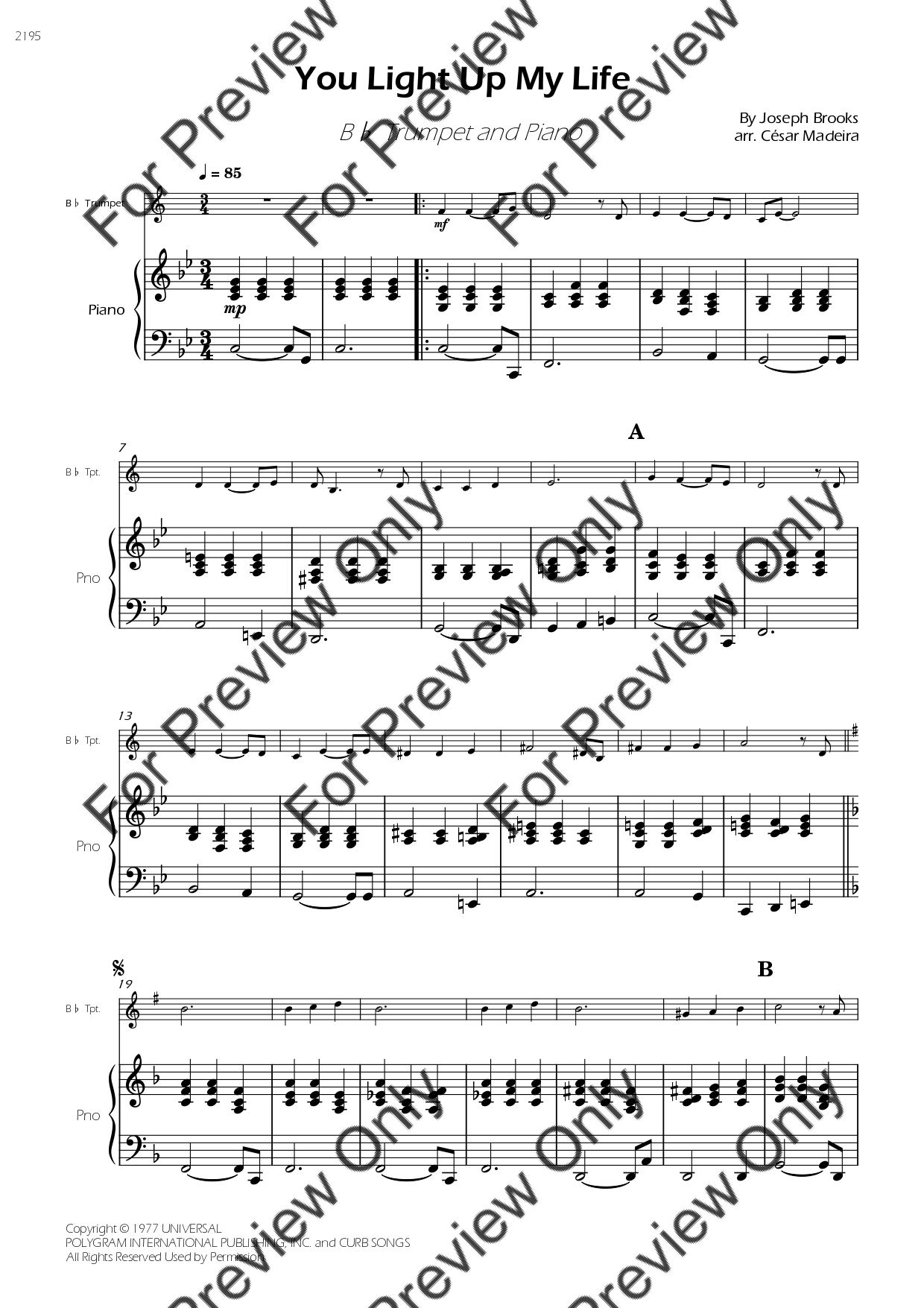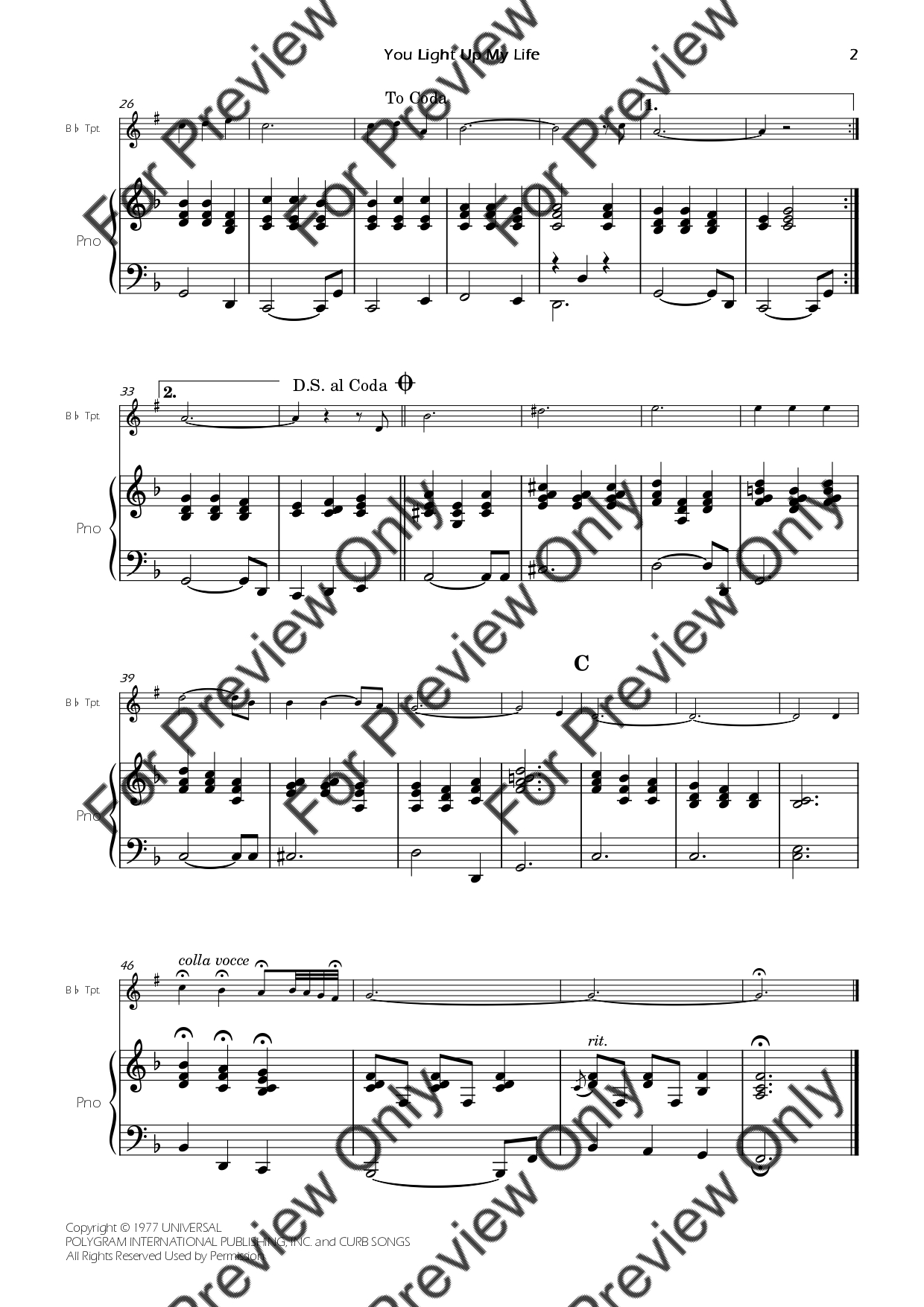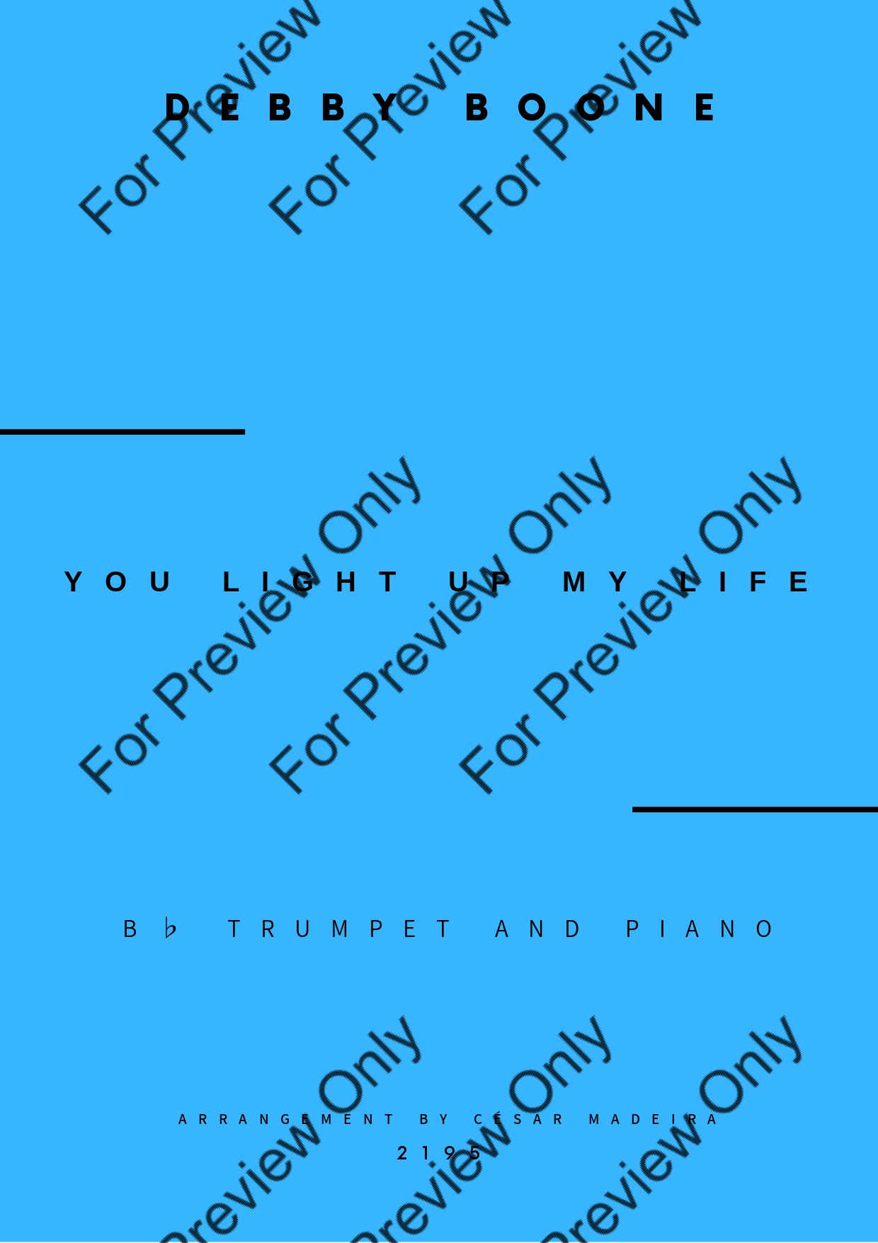 You Light Up My Life by Debby Boone. Arrangement for Bb Trumpet and Piano. With Full Score and Individual Parts. Have fun!