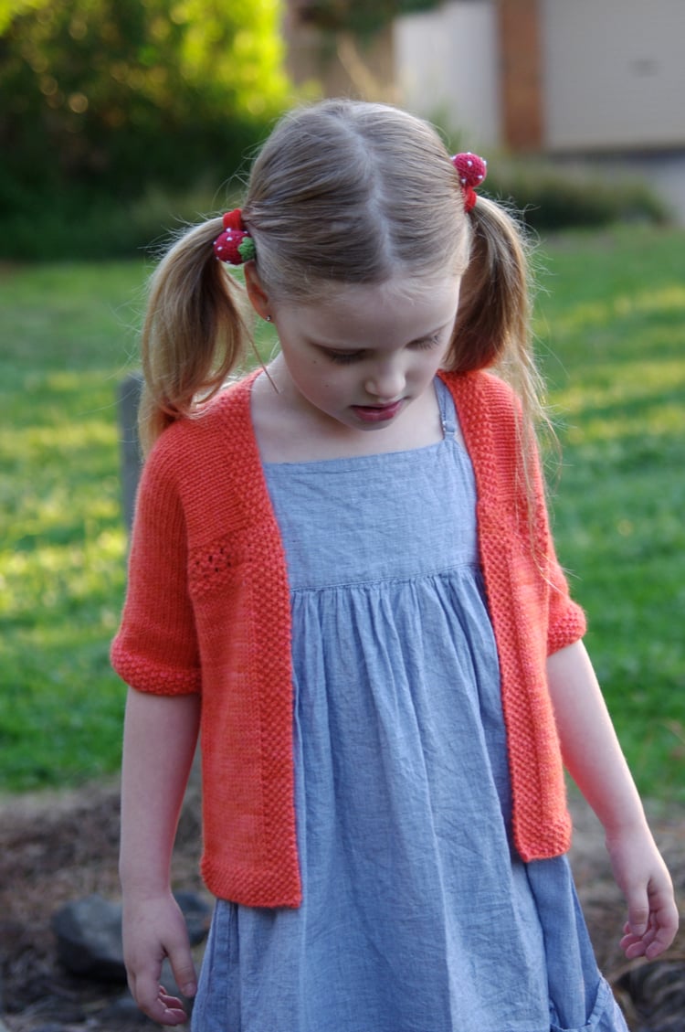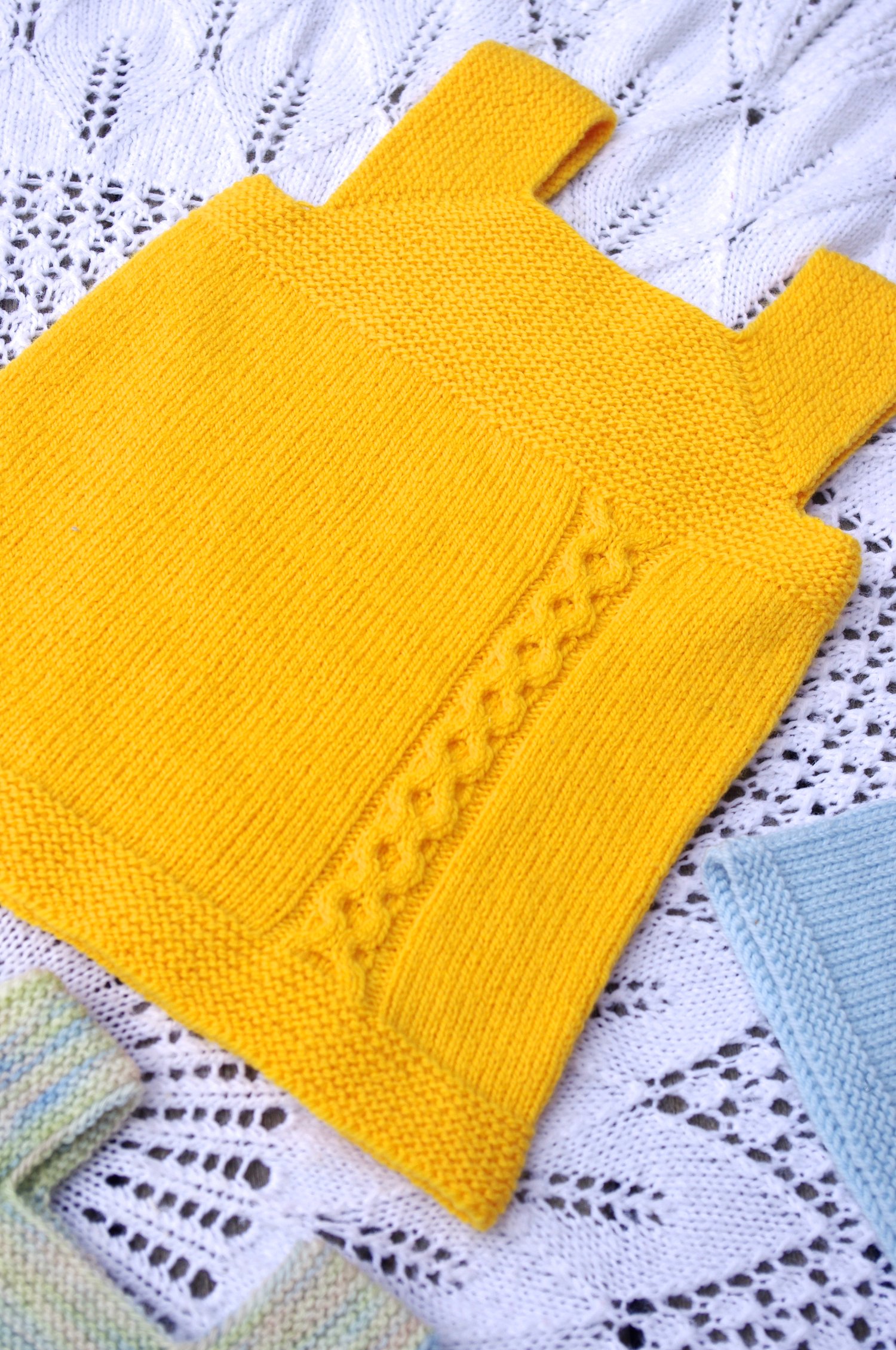 Milo Bambino is knit seamlessly in the round from the top down. Increases are used to shape the mitred bodice, with a simple cable gracing the front of the vest.
