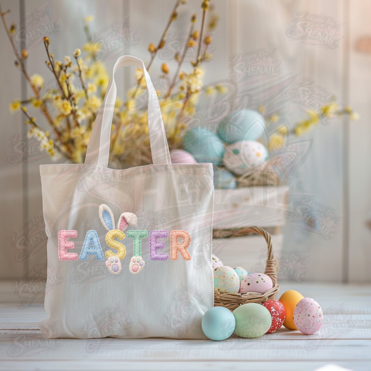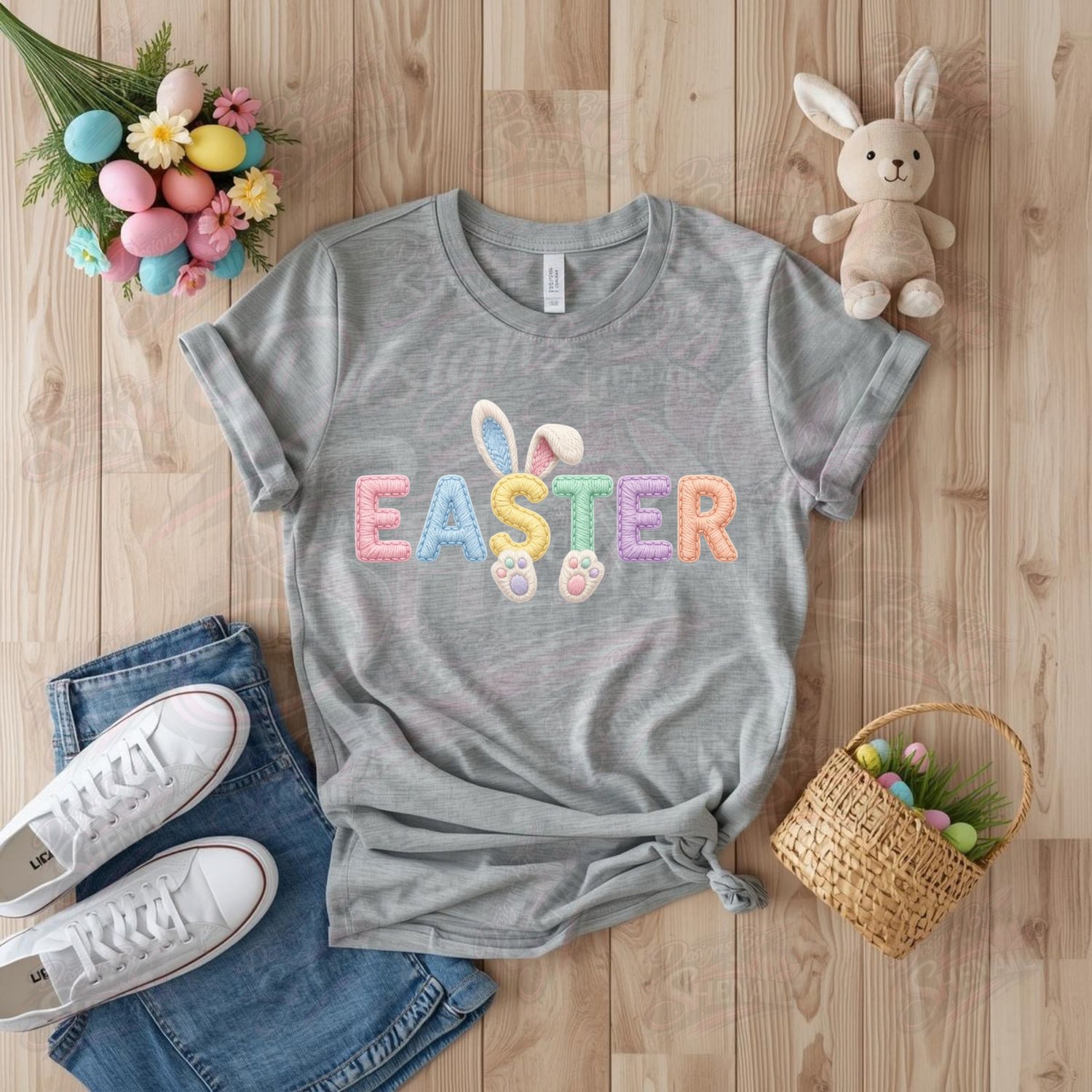 Celebrate spring with this adorable EASTER bunny design featuring pastel letters, playful bunny ears, and cute bunny paw prints. The soft stitched-style lettering gives this design a cozy handmade feel that looks beautiful on shirts, tote bags, mugs, and more.