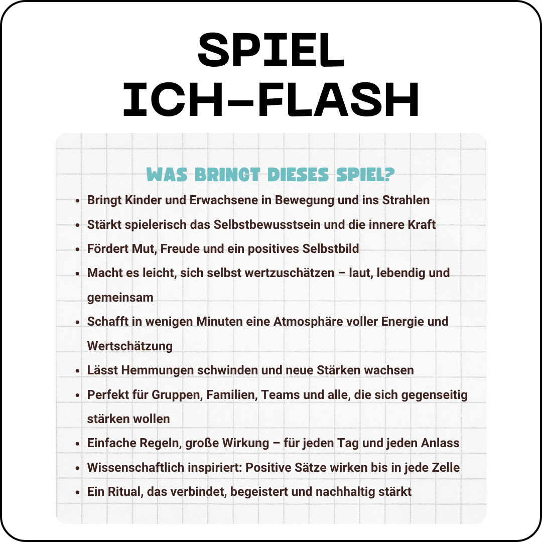 Mit ICH-FLASH! bringst du frischen Schwung in jede Runde – egal ob zu Hause, in der Schule, im Team oder in der Gruppe.