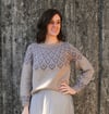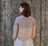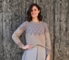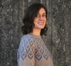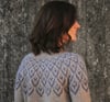 This garment is worked top-down, in the round. After the neckband, short row shaping is incorporated to optimise fit. The majority of the yoke features a stranded colourwork pattern. Once the yoke is completed, stitches are separated into body and sleeves, which are each worked separately and in the round. Before the cuffs, a section of stranded colourwork is added to the sleeves, which echoes the pattern of the yoke colourwork.