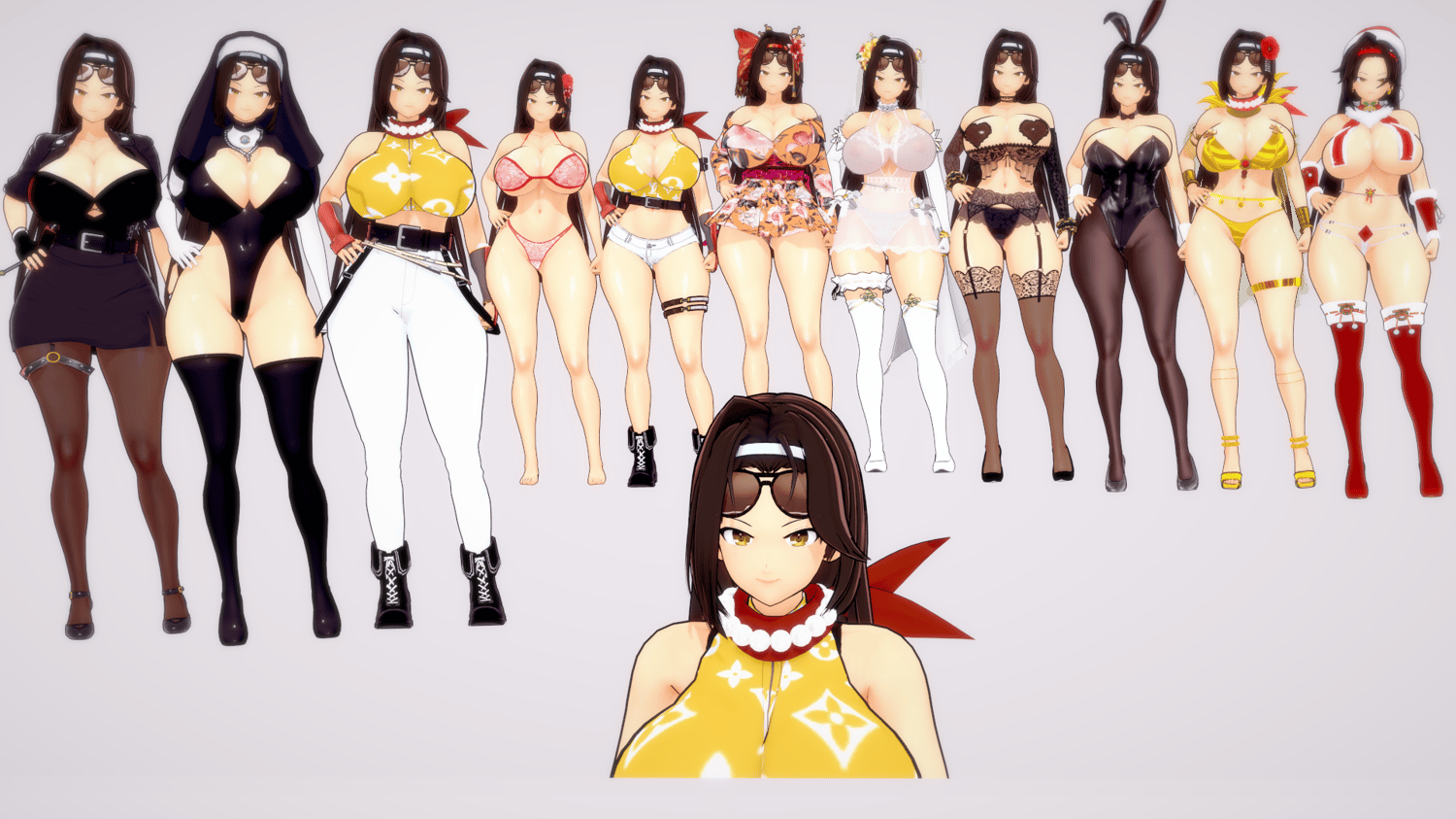 Tsubaki includes various costumes: normal, shinobi, bunny, bikini, weeding, christmas, nun, golden, lingerie, etc.