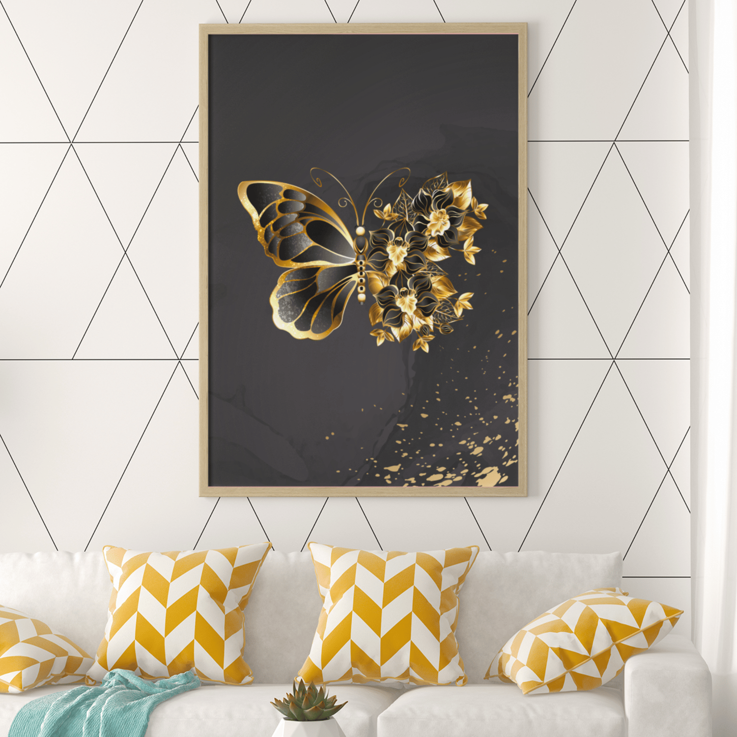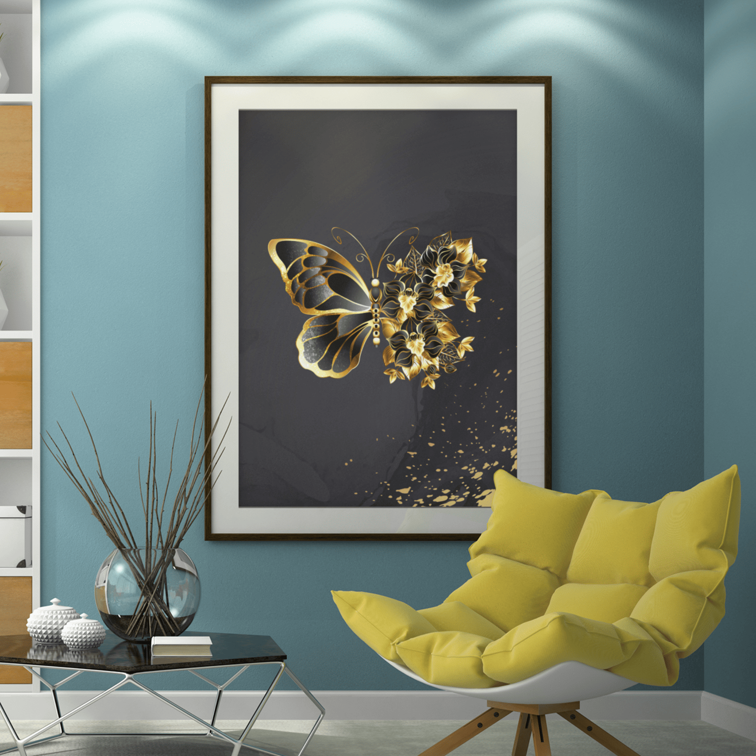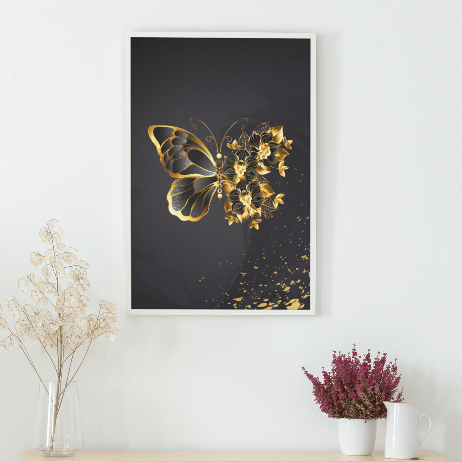 This printable artwork combines a delicate butterfly with floral gold elements—symbolizing transformation, beauty, and strength. U.S. buyers especially love black & gold décor because it adds instant glamour to any space.