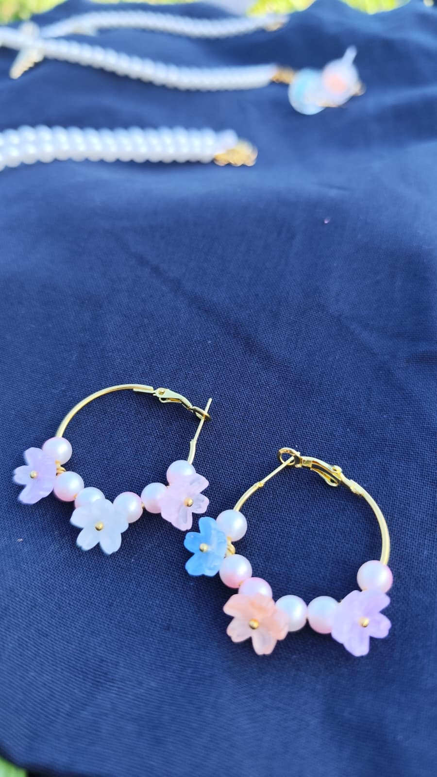 Estos pendientes de aro con perlas y flores son la combinación perfecta de delicadeza y encanto. Las perlitas aportan un brillo suave y elegante, mientras que las pequeñas flores añaden un toque tierno y femenino que los hace irresistibles. El diseño es ligero, armonioso y súper bonito, ideal para quienes buscan un accesorio que aporte dulzura sin perder estilo.