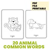 - 20 pages with animals in spanish : perro, león, oveja, pinguino, búho, mapache, koala, gato, tigre, caracol, erizo, ballena, zorro, oso,rana, elefante, mono, oso panda, tortuga, abeja