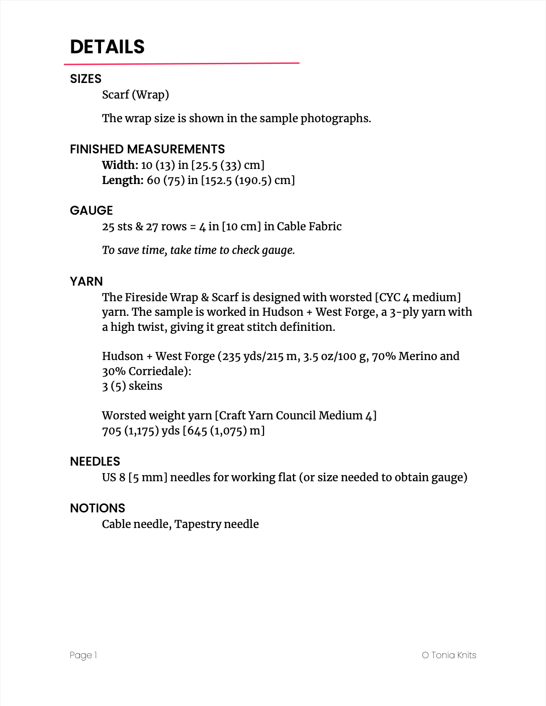 25 sts & 27 rows = 4 in [10 cm] in Cable Fabric