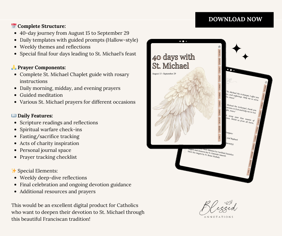 Step into the beautiful Franciscan tradition of St. Michael's Lentβa 40-day period of prayer, fasting, and spiritual preparation that mirrors the devotion of St. Francis of Assisi himself. This comprehensive digital planner guides you through each sacred day from the Feast of the Assumption to the glorious celebration of St. Michael the Archangel.