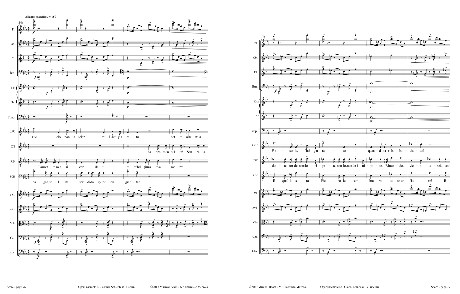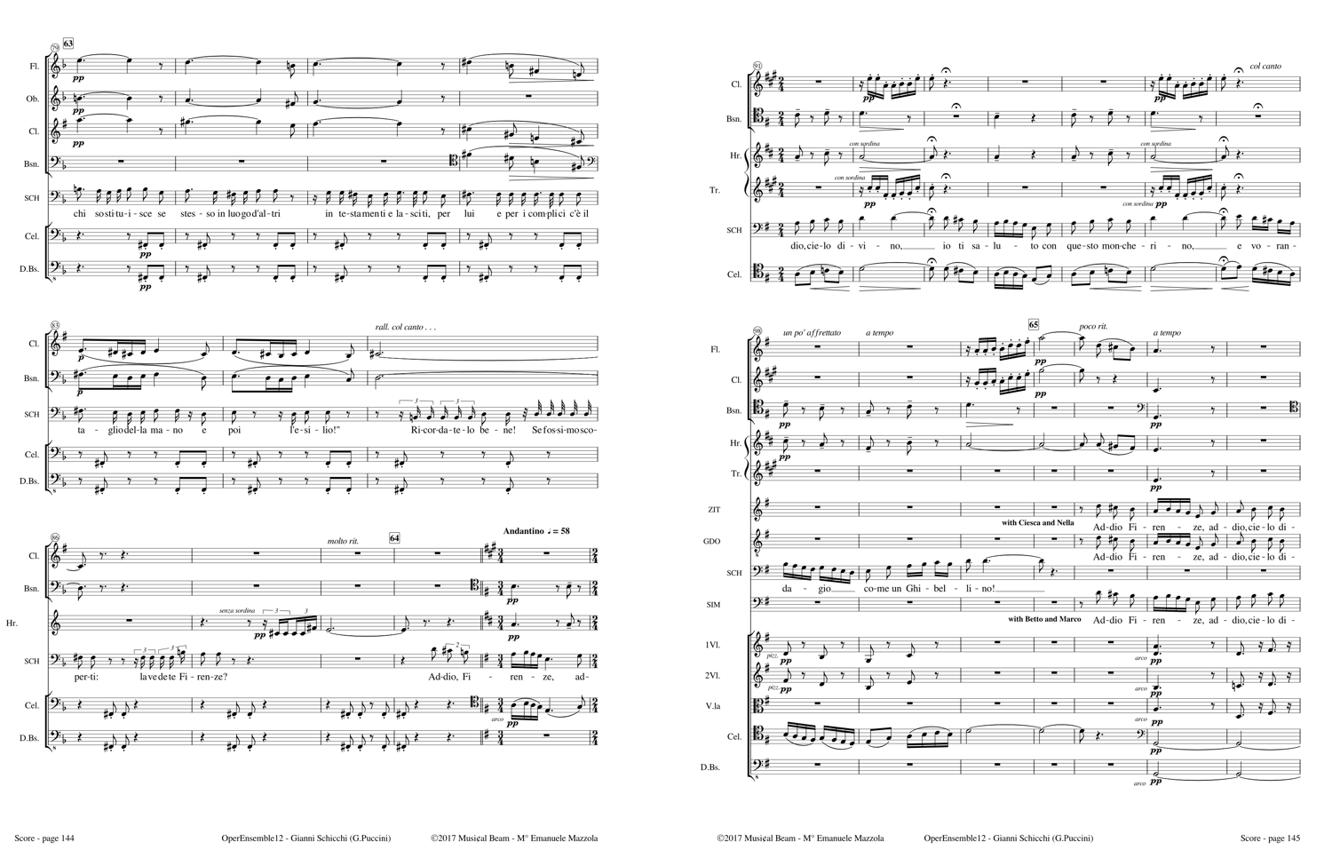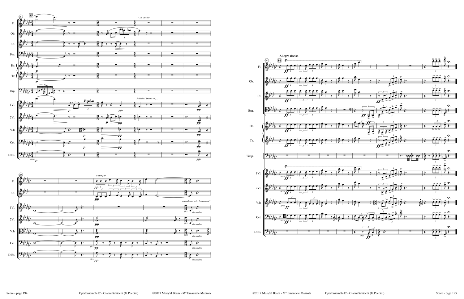 With only one player per string part, careful attention must be given to sound balance. Unlike the Chamber Orchestra version, which includes a fuller string section, the reduced string forces can be easily overpowered by winds or percussion. We recommend subtle amplification of the strings where possible, or alternatively, strategic dynamic adjustments—such as reducing wind and percussion volume—to maintain clarity and ensemble blend. Gianni Schicchi for Chamber Ensemble is under preparation and will require: