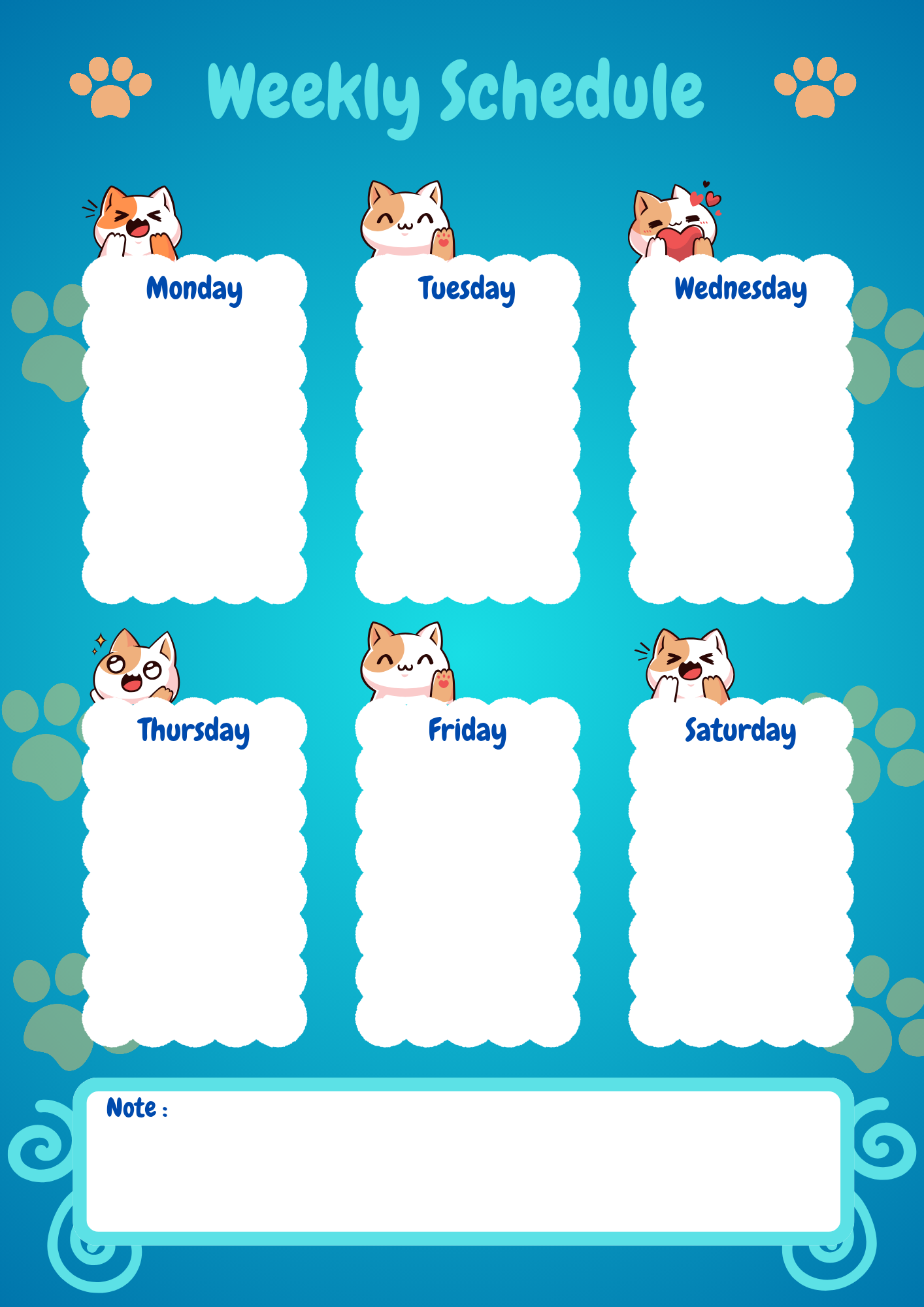 Stay organized and add a touch of cuteness to your week with this cat-themed weekly schedule planner. Featuring charming illustrations of playful cats for each day of the week, this planner is perfect for cat lovers and anyone looking to brighten up their planning routine. The planner includes sections for Monday through Saturday, as well as a note section for additional reminders. Download now and make planning fun and delightful!
