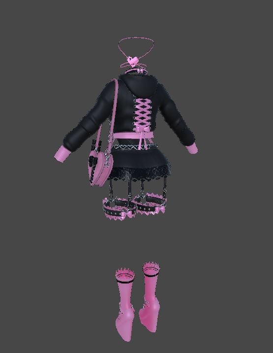 ♡ 9 Part outfit: Bag, Bodysuit, Garters, Eyepatch, Hoodie, Shoes, Skirt, Socks.