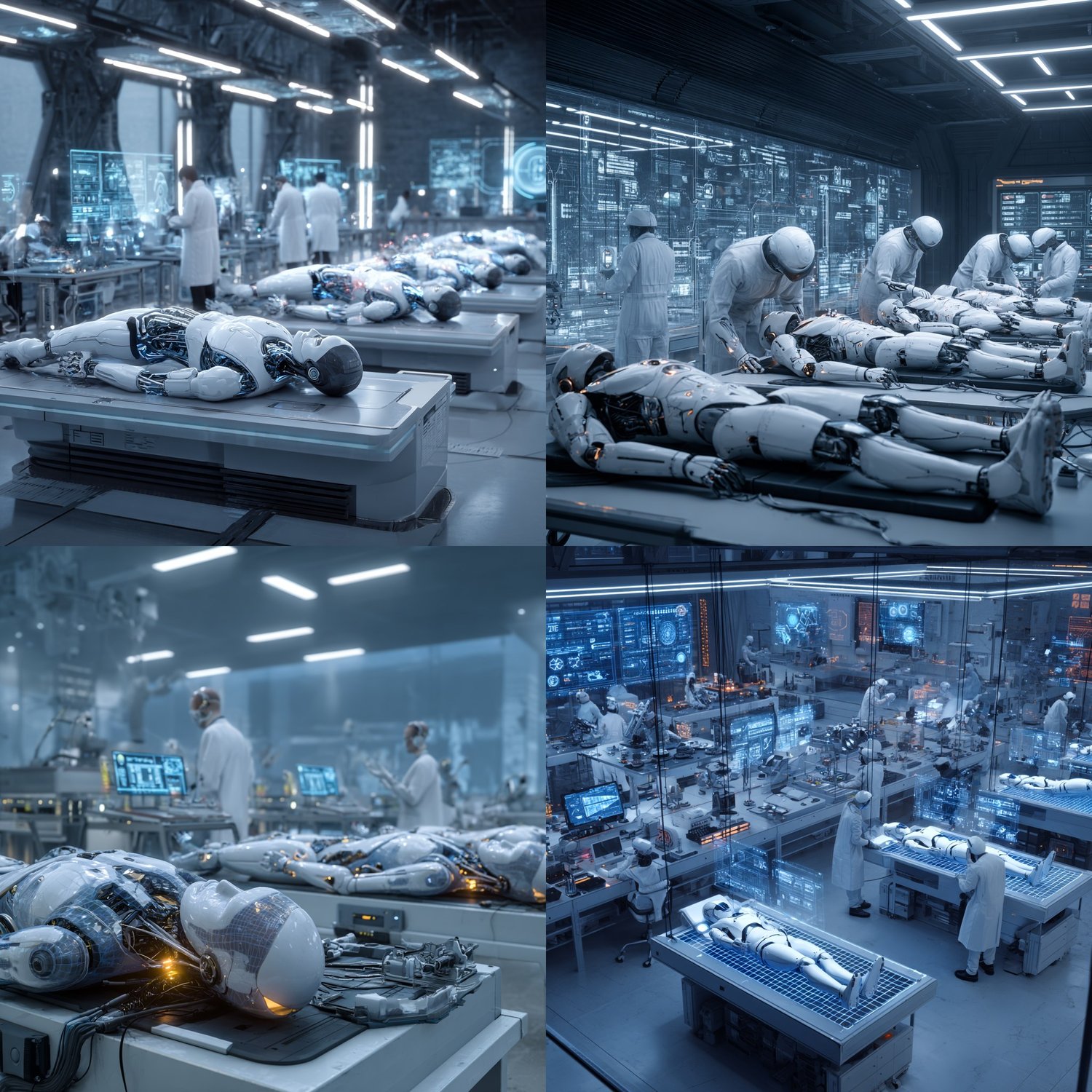 Create premium, ultra-detailed cinematic sci-fi scenes of synthetic humanoid robots lying on futuristic laboratory tables, surrounded by scientists in white coats working with holographic screens and advanced instruments. Cinematic lighting, high-tech atmosphere, and dramatic composition bring depth and realism to the scene. Perfect for concept art, sci-fi storytelling, game assets, or futuristic editorial visuals. Keywords: sci-fi, humanoid robots, futuristic laboratory, cinematic lighting, ultra-realistic, high-tech, detailed composition, concept art, AI art, futuristic science.