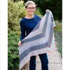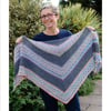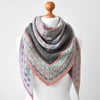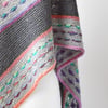 This top down triangular shawl is a fun and colourful addition to any wardrobe. Bejeweled uses panels of garter stitch in neutral shades highlighted with colourful stripes and little pops of colour that decorate the shawl like jewels.