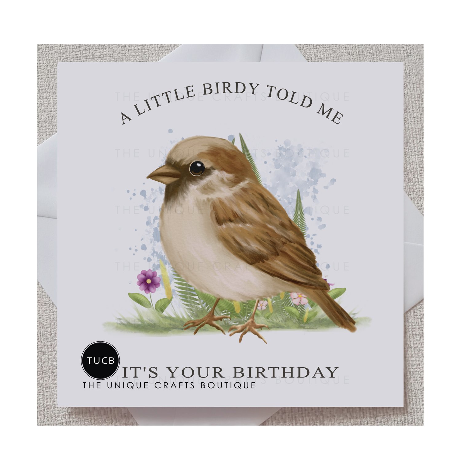 Printed with a cute watercolour Sparrow and displaying the message 'A little birdie told me' across the top with 'it's your Birthday' below. This card is certain to make any bird spotter smile.