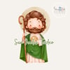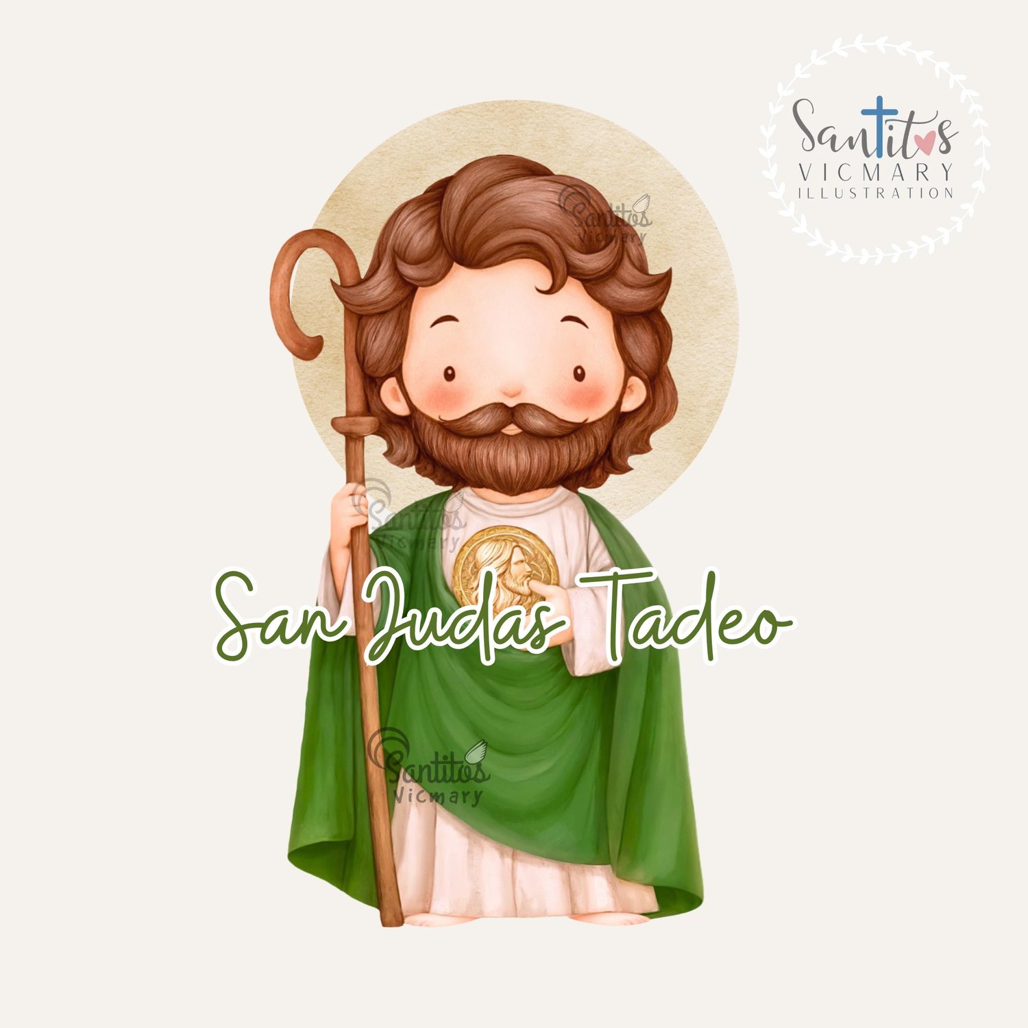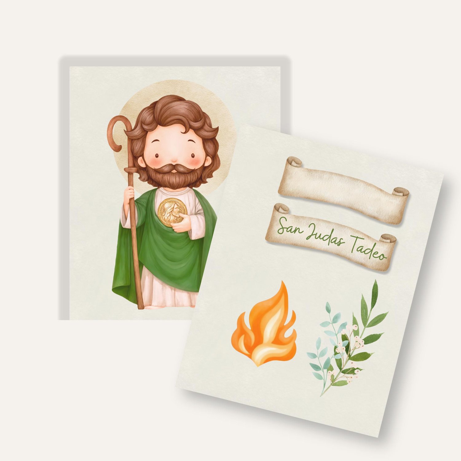 1x Ilustración principal de San Judas Tadeo: La imagen del santo con su icónico medallón de Jesús y la llama sobre su cabeza, en un estilo dulce y moderno. Ideal para estampitas, oraciones, recordatorios y más.
