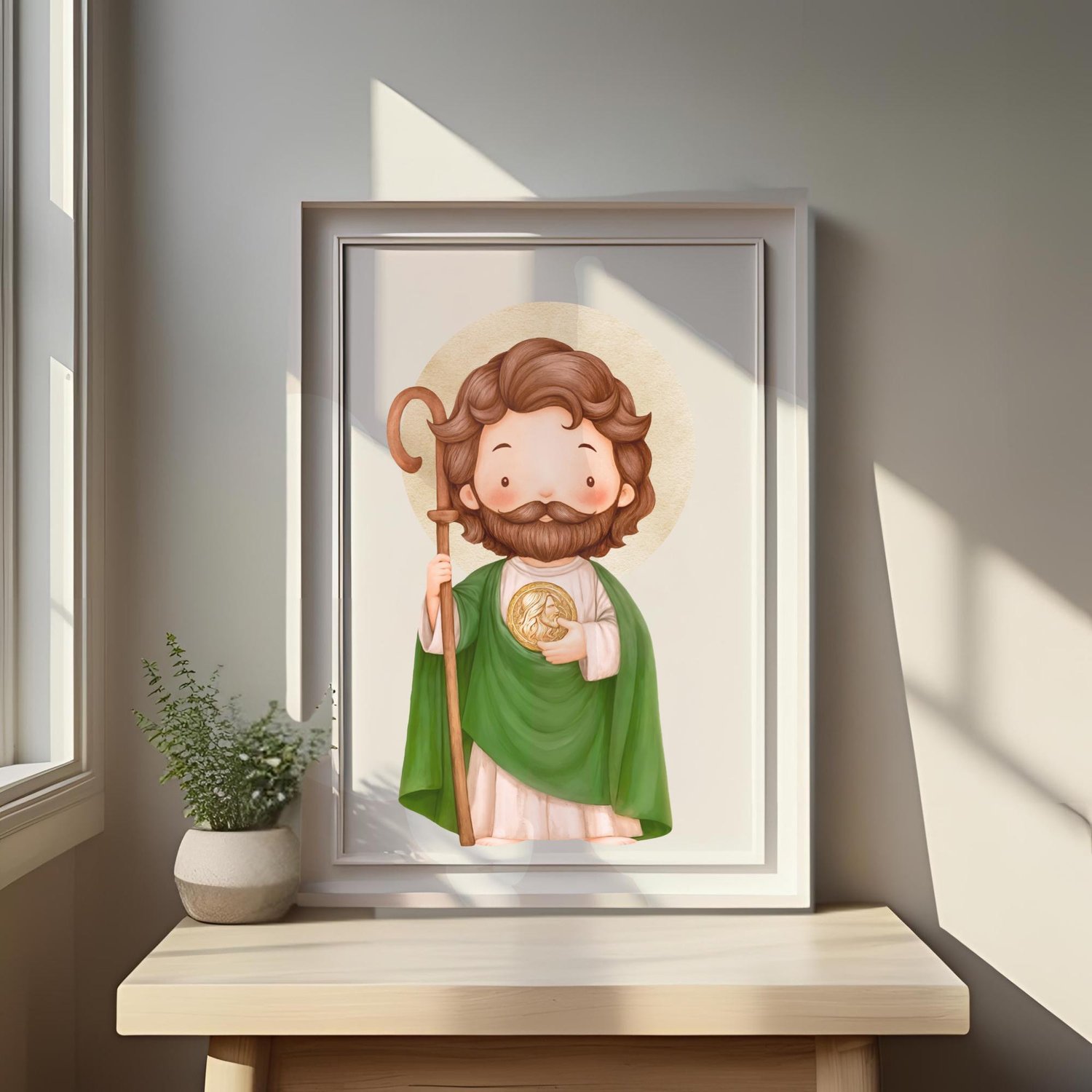 Rinde homenaje a la poderosa intercesión de San Judas Tadeo, el Patrono de los Casos Difíciles y Desesperados, con esta hermosa ilustración digital en acuarela. Su figura es un faro de esperanza y consuelo para millones de devotos que buscan su ayuda en momentos de angustia. Capturada en un estilo tierno y delicado, esta imagen es perfecta para una variedad de proyectos creativos y devocionales.
