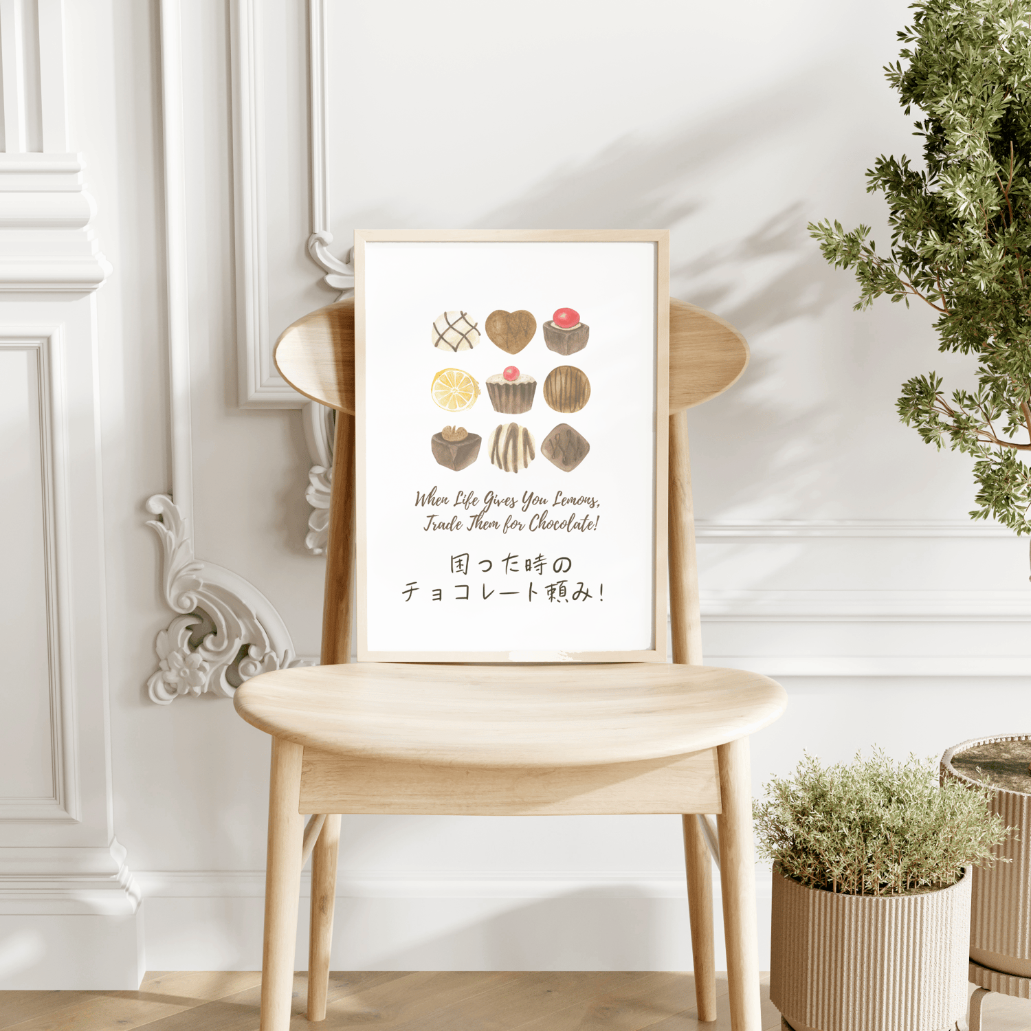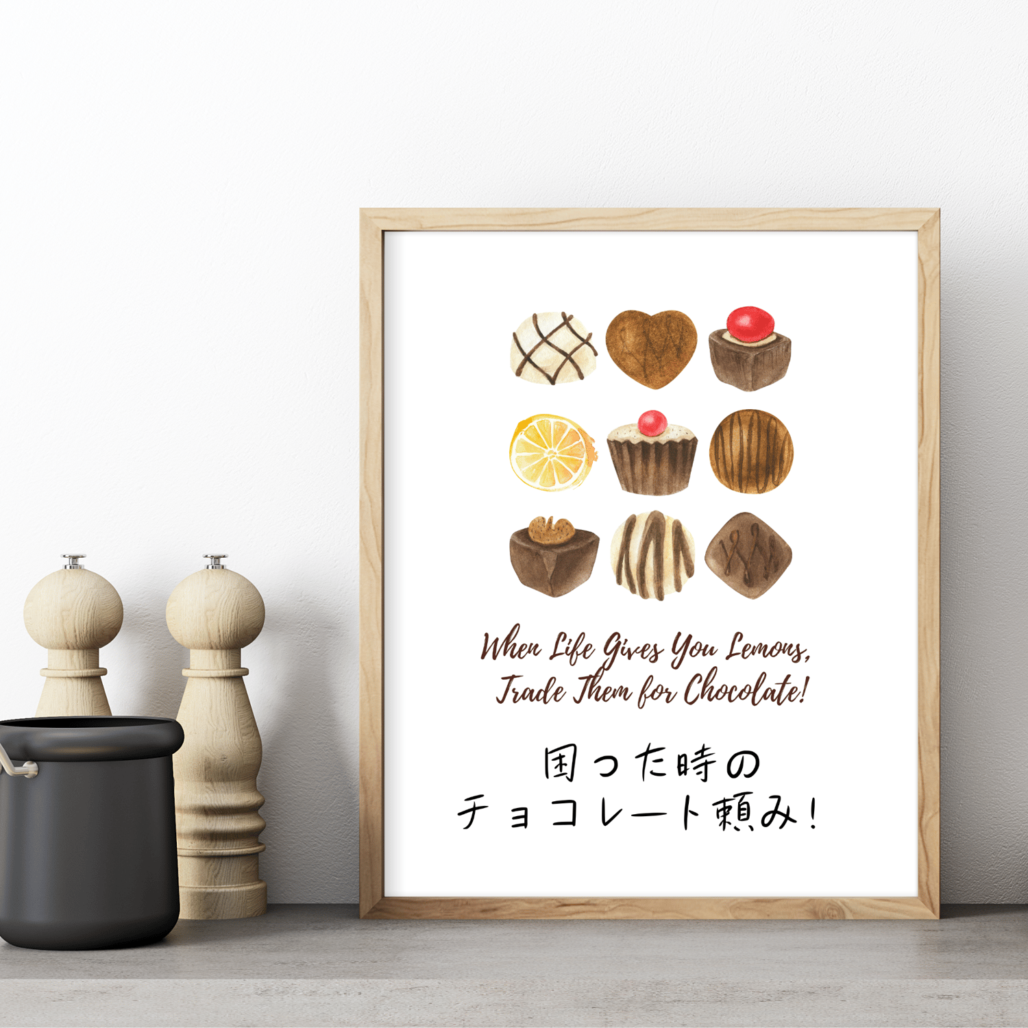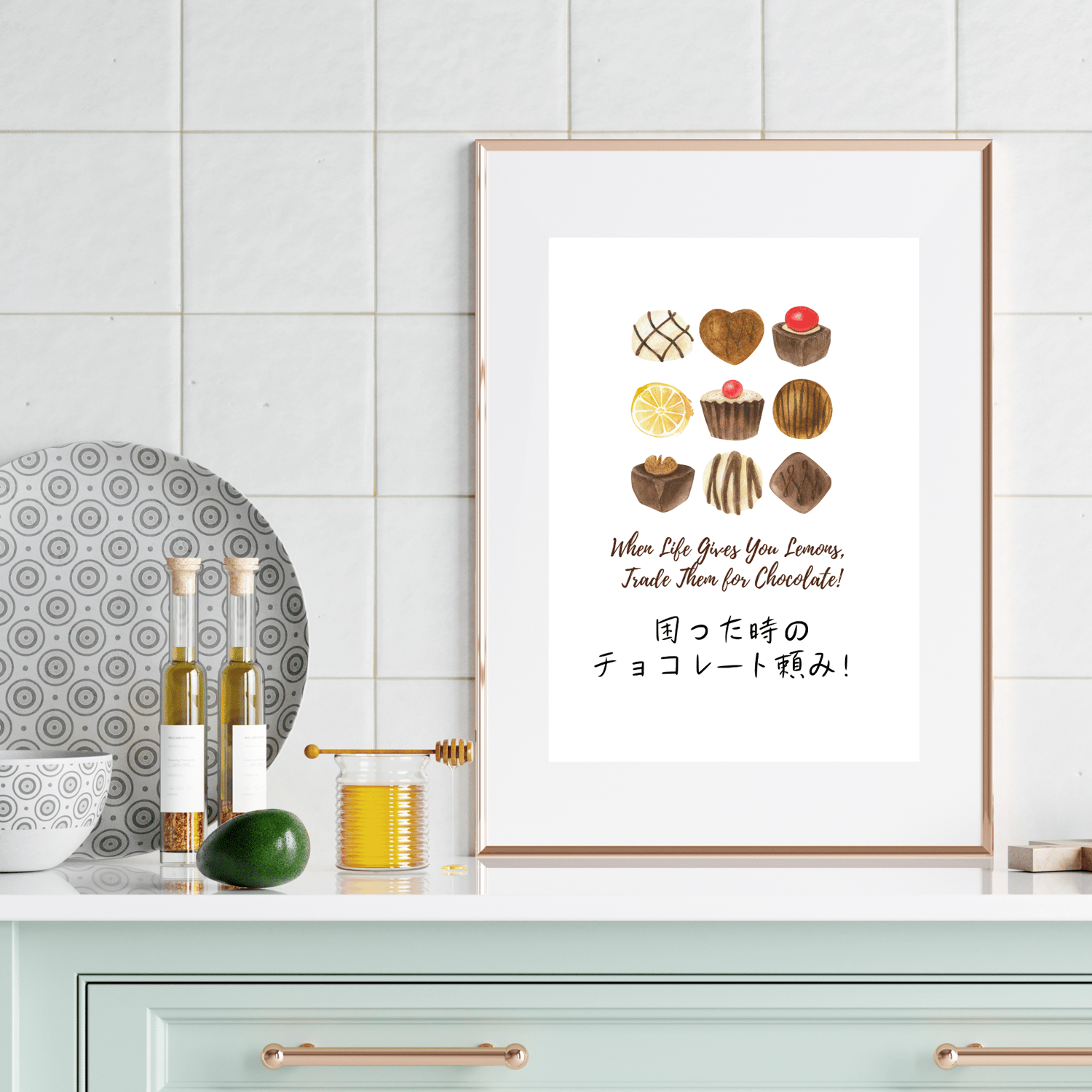 Add a touch of sweetness to your kitchen with this adorable chocolate-themed wall art. Featuring a vibrant watercolor illustration of various chocolates, this piece is enhanced with a cheerful quote in both English and Japanese. Printed on high-quality paper, this wall art brings charm and positivity to any space, making it a delightful addition to your kitchen decor. The combination of the cute chocolate illustrations and the uplifting quotes creates a warm and inviting atmosphere.