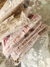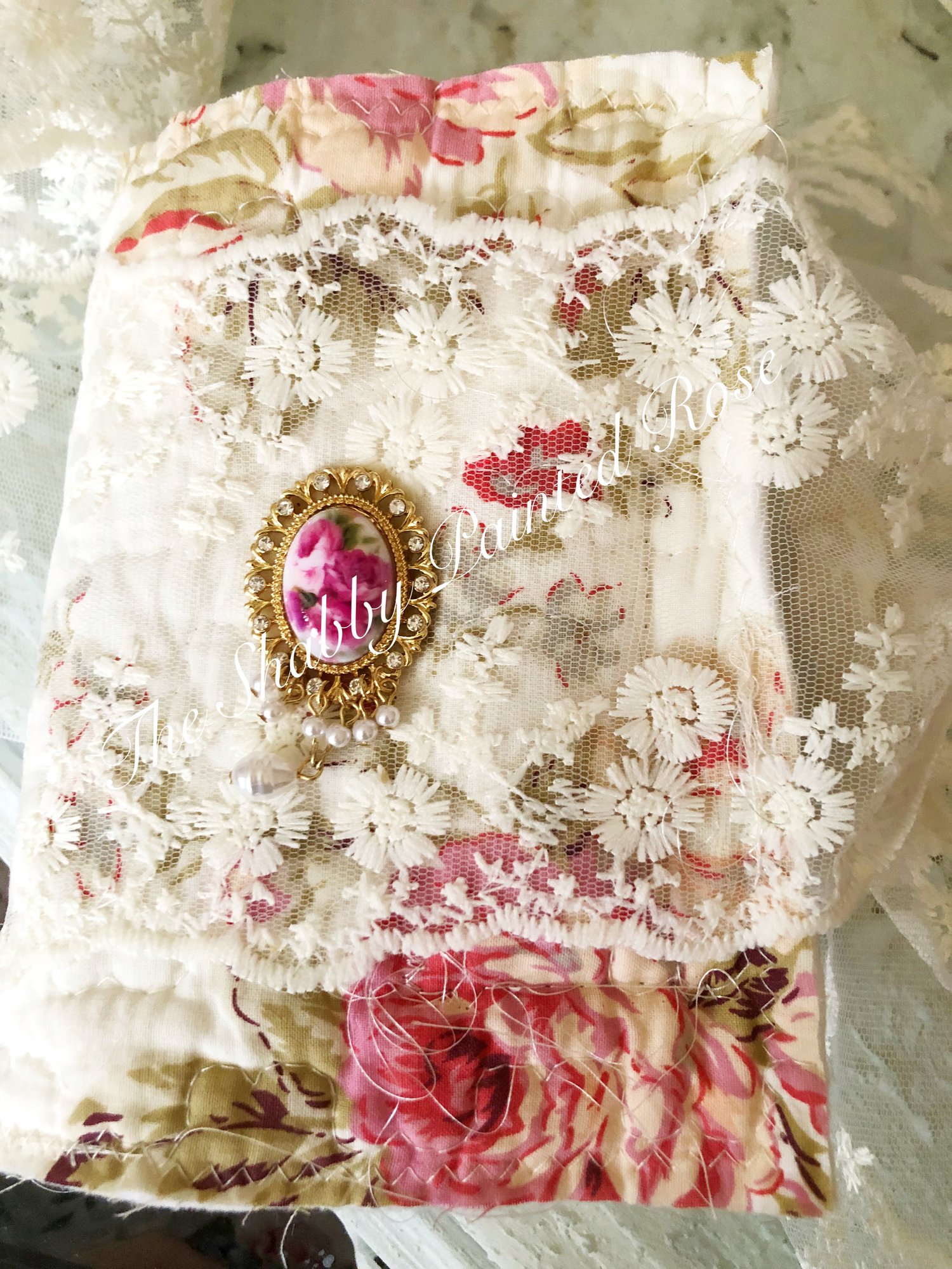 This beautiful handmade needle book is a functional book, blending the rustic charm of Vintage Shabby Quilt with delicate lace Embellishments . Its exterior features a soft, padded cover with lace and a beautiful broach. Beautiful pages pockets, tuck spots, & pin cushions. Use this beautiful book for your journaling, sewing embroidery, right at your fingertips. A beautiful display.
