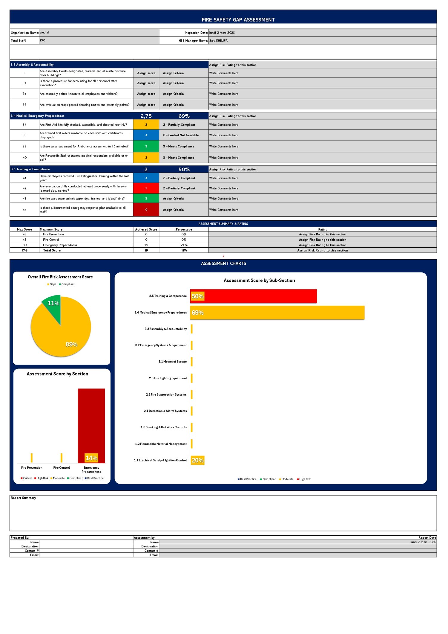 Ensure your workplace is fully compliant and protected with this professional Fire Safety Gap Assessment template. Designed to help organizations systematically evaluate their fire prevention measures, this tool allows you to quickly identify compliance gaps, prioritize corrective actions, and strengthen overall safety performance.