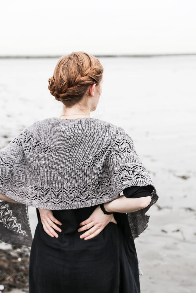It fits perfectly over your shoulders and drapes in a way which is very pleasing to the eye. It’s worked top down with lacey increases.