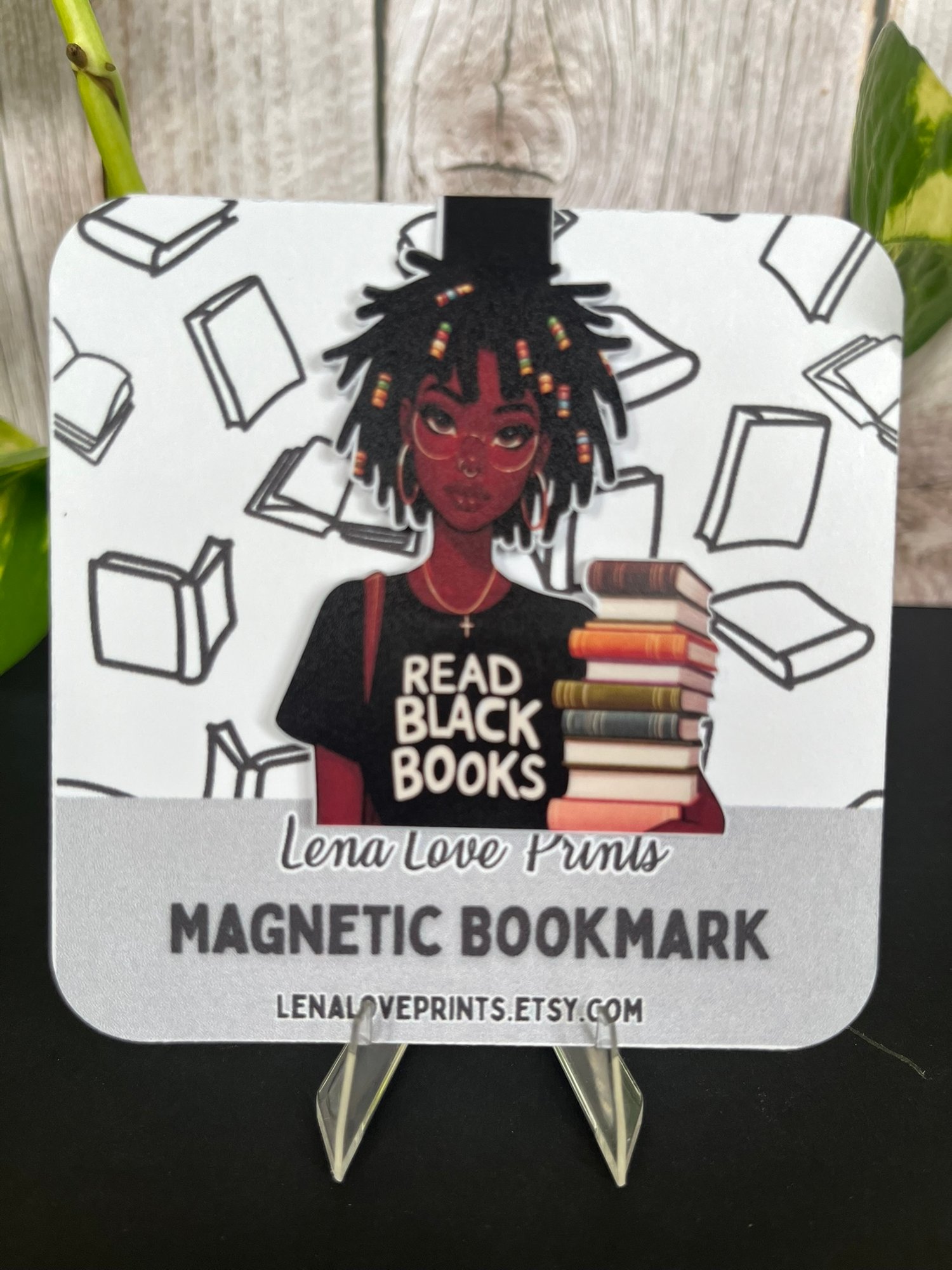 These magnetic bookmarks celebrate the brilliance and creativity of Black readers everywhere. Featuring an illustrated Black woman with natural hair and a “Read Black Books” tee, this design embodies culture, pride, and a deep love for literature. Crafted from sturdy cardstock and high-quality magnets, each bookmark holds your place securely—no more creased pages or lost spots.