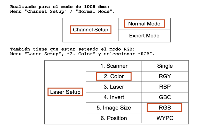 - Realizado para el modo "Channel Setup / Normal Mode", que es de 10CH y para el modo RGB: "Laser Setup / 2. Color / RGB".