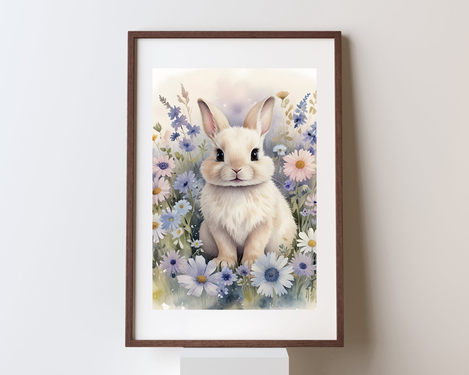 Printable Watercolor Baby Bunny Wall Art – Fluffy Bunny in Pastel Flower Field | Nursery Animal Decor