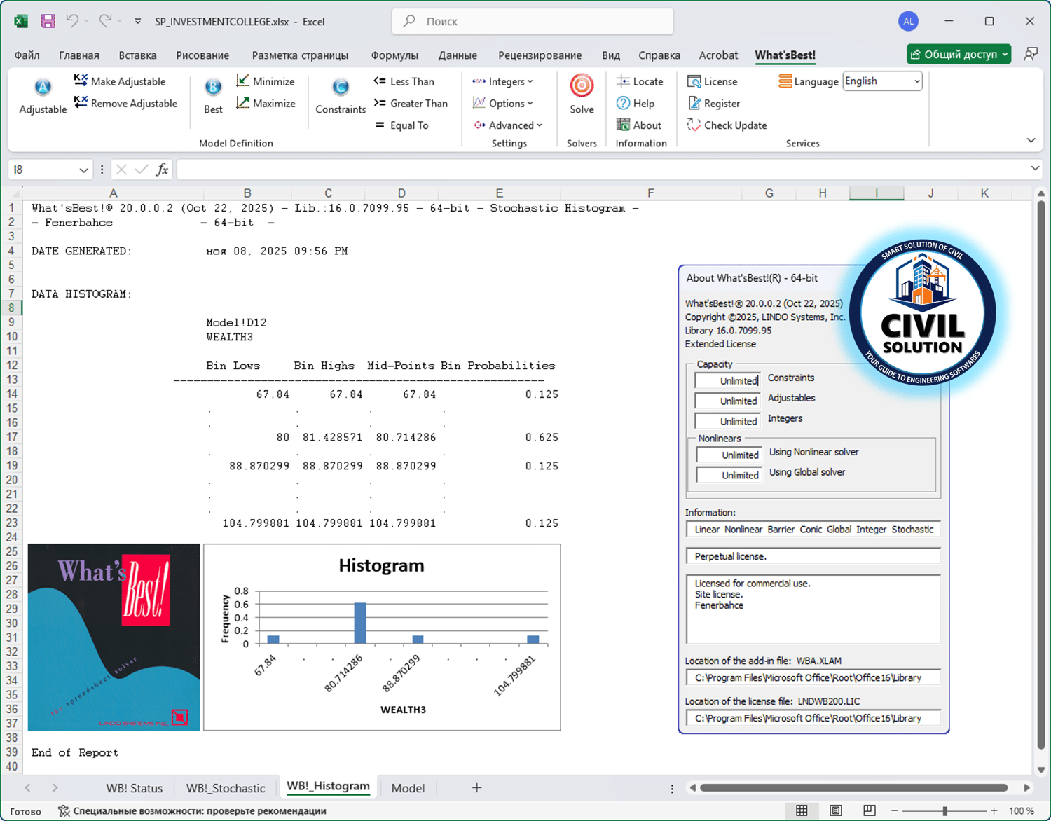 📘 LINDO What’sBest! v20.0.0.2 is a professional optimization and decision-support add-in for Microsoft Excel from LINDO Systems. It lets analysts, operations researchers, planners and managers build, solve and analyze large-scale optimization models (linear, integer, nonlinear and mixed models) and perform scenario/sensitivity analysis directly inside Excel. What’sBest! is widely used in supply-chain optimization, production planning, portfolio optimization, scheduling, pricing and other decision-making applications.