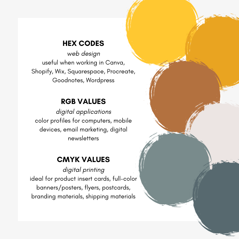 + Detailed Hex Codes, RGB, and CMYK values for each color