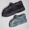 The slippers are worked from the ankle down and closed along the length of the sole with Kitchener stitch.