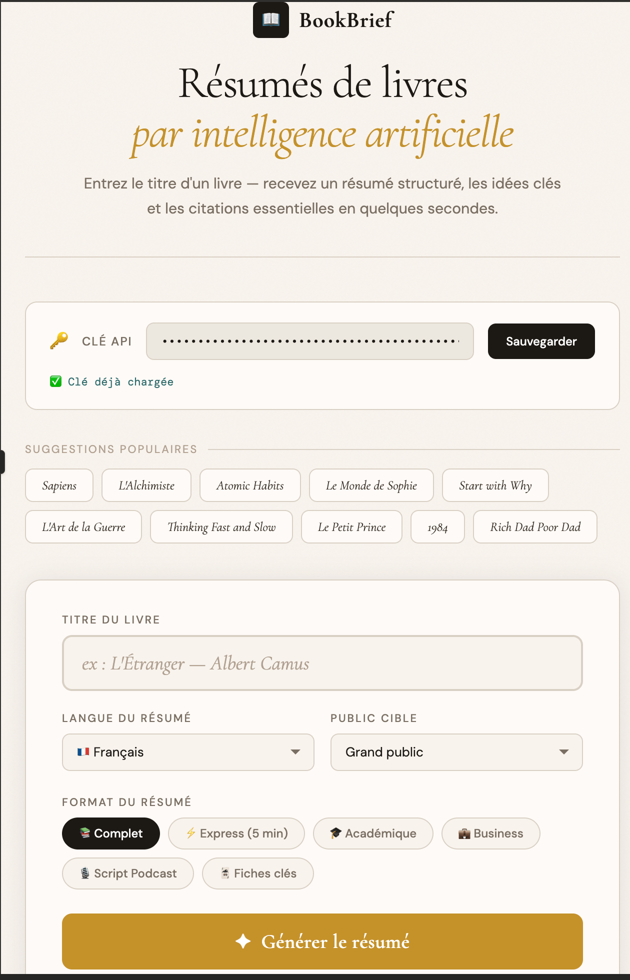 Vous entrez un titre de livre. BookBrief envoie une requête structurée à l'IA Claude, qui connaît un très