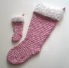 The Velvet & Fur Stocking is a standard-sized stocking, and the mini Christmas stocking is perfect as a gift card holder. Both use the same materials (hook size, bulky weight velvet yarn, super bulky faux fur yarn).