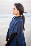 The Torque Poncho has a simple construction of two rectangular panels, worked flat from the bottom up. The neck is shaped with short rows on the front panel, while the collar is picked up after seaming.