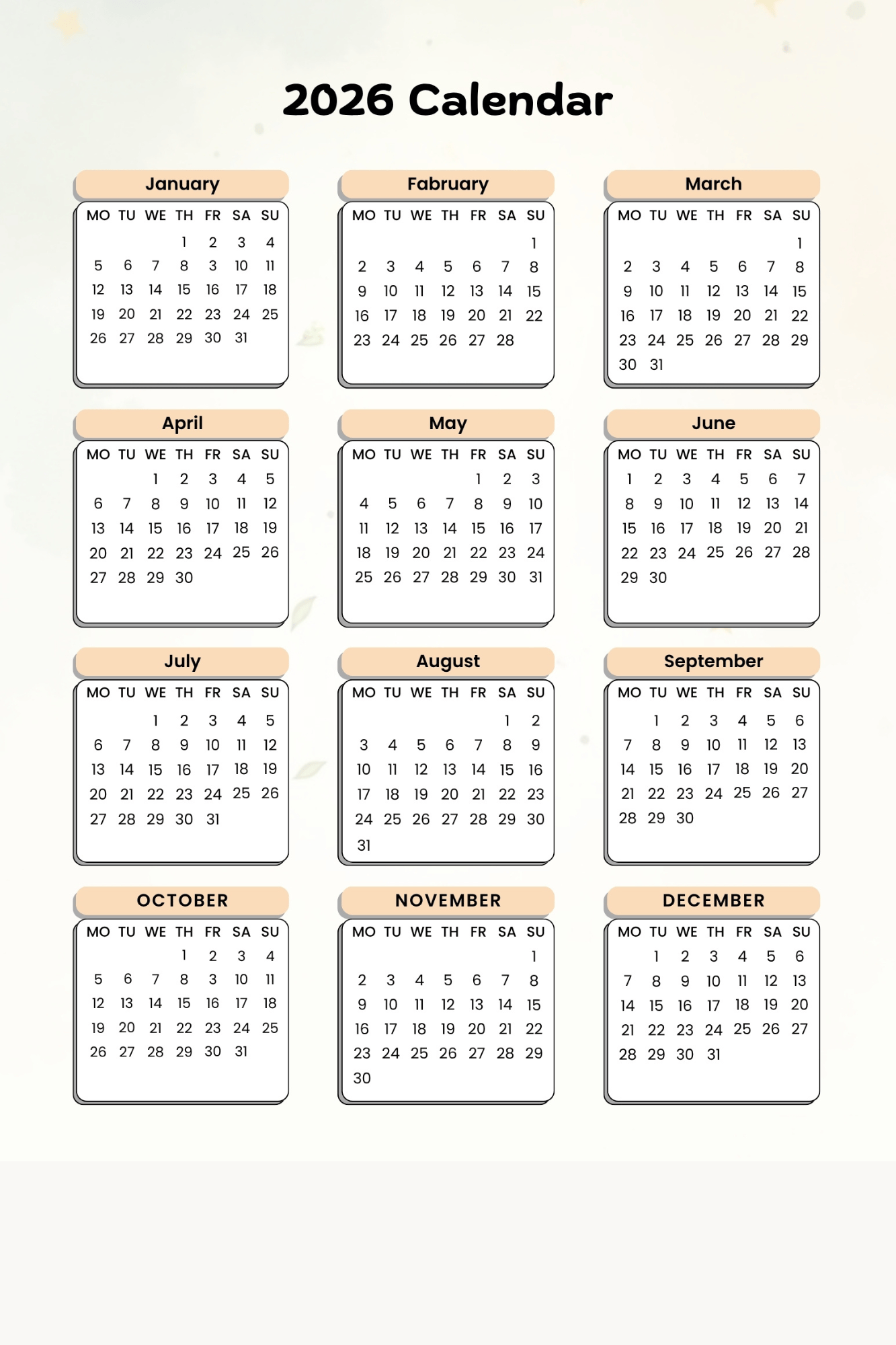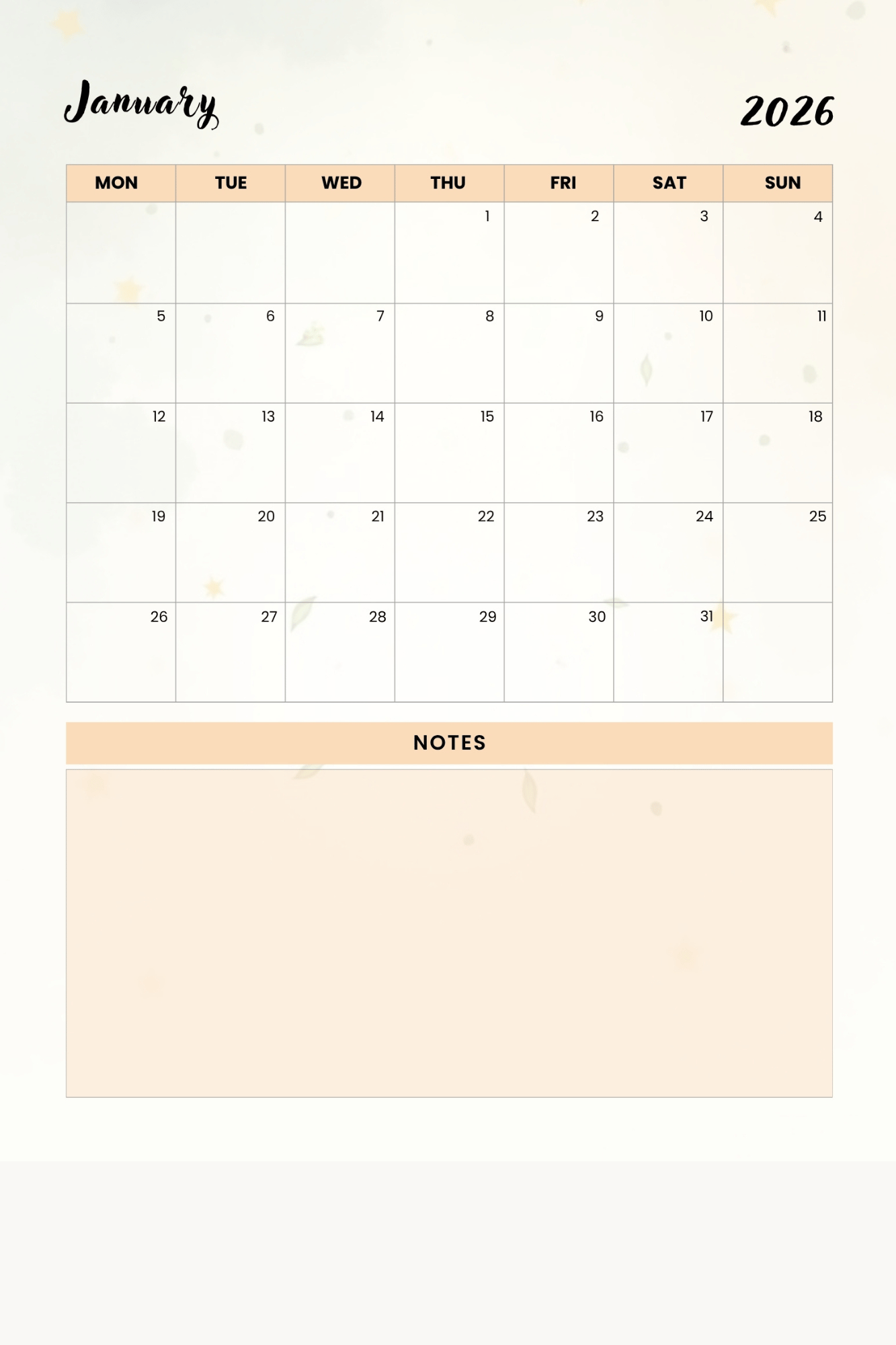 - Undated January–December 2026 monthly calendars for planning your days, goals, and appointments